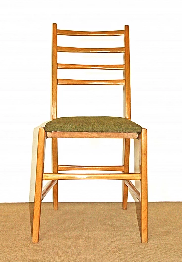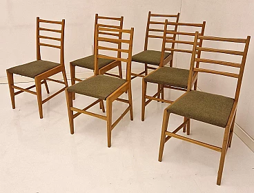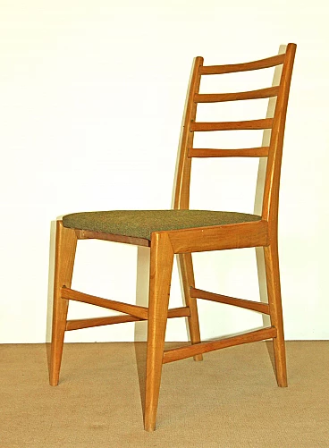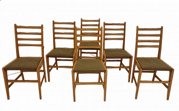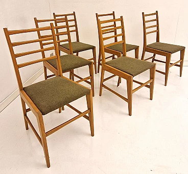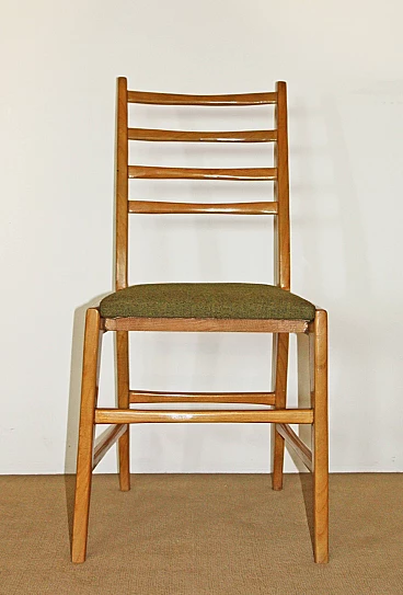 Sei sedie originali degli anni ‘50, costruite secondo la tradizione artigianale brianzola ma con un design che vuol lasciarsi alle spalle sedie e mobili anteguerra. La linea si definisce in maniera più essenziale e incisiva; la sedia è solida, in legno massello naturale che sembra aver perfettamente recepito la lezione di Gio Ponti. L’imbottitura è ridotta al minimo è presente solo sulla seduta rivestita in un tessuto color verde muschio che ben si abbina al legno naturale, mentre lo schienale si forma con quattro listelli orizzontali. Il set di 6 sedie proposto è in buono stato con lievi segni del tempo, non è mai stato usato ma necessita di trattamento anti tarlo. Il prezzo si riferisce al set di 6 sedie.