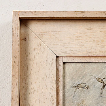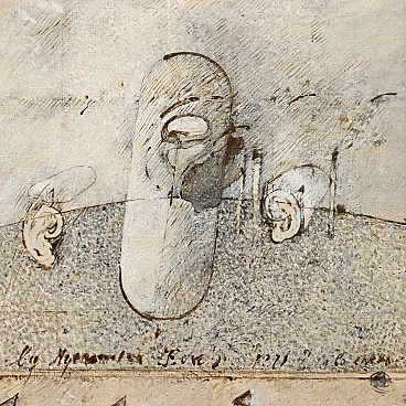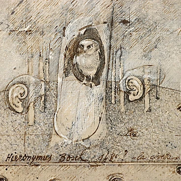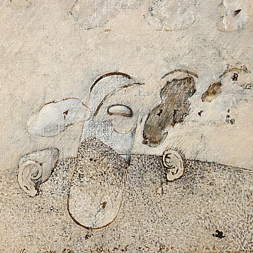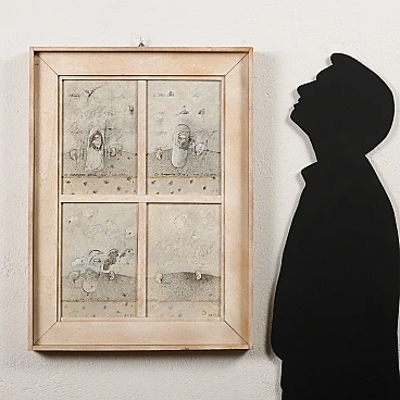 Opera "Composizione a quattro pannelli" di Gabriella Benedini (1932) del 1978. Dipinto a tecnica mista su tela applicata a pannelli lignei che propongono una sequenza. In basso a destra la sigla dell'artista GB e la numerazione dei pannelli; al verso di ciascun pannello sono presenti la firma per esteso, la data e i seguenti titoli sequenziali: "By Bosch", "Declinazione di una civetta", Trascrizione" e "Scomparsa per civetteria". Gabriella Benedini ha definito la sua figura d'artista come "un nomade alla ricerca del senso profondo delle cose". Anche se attratta e interessata dalla pittura astratto-informale prima, dal Realismo Esistenziale e dalla Nuova Figurazione poi, Benedini procede per una ricerca strettamente personale non assimilabile ad alcuna corrente specifica. Tutti gli anni '70 sono segnati prevalentemente da opere pittoriche che sono il riflesso di spunti letterari filtrati dal suo bisogno di crescita e di confronto. Attraverso poi la sua passione per l'Alchimia, Benedini comincia a trasformare in opere d'arte qualsiasi cosa le capiti sottomano: conchiglie, pagine di vecchi libri, flaconi, tutto si combina in un insieme armonioso che ricorda gli spazi. I suoi lavori diventano perciò soprattutto tridimensionali, o da appendere a parete, oppure sono sculture, anche di grandi dimensioni. I quattro pannelli sono qui presentati in cornice unica.