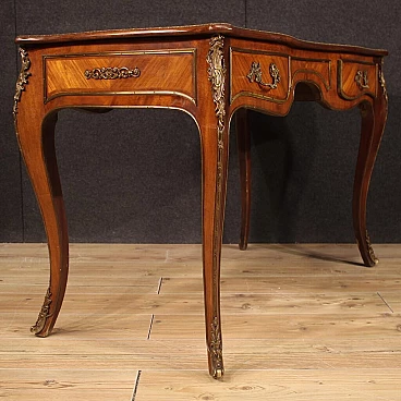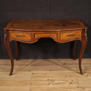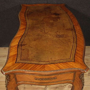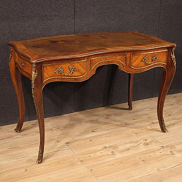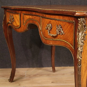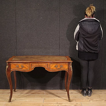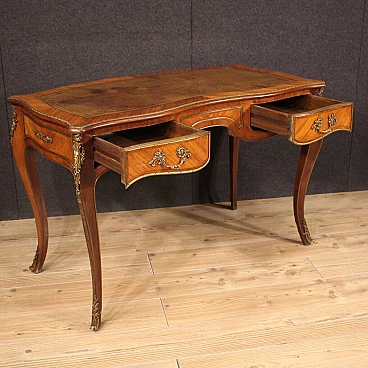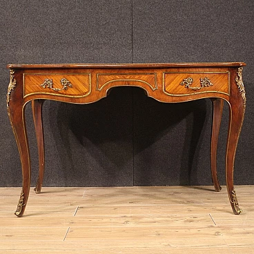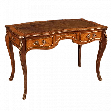 Scrittoio stile Napoleone III realizzato in Francia a metà '900. Mobile di bella linea e piacevole arredamento in legni di bois de rose e mogano. Scrittoio finito da centro riccamente adornato da bronzo e ottone dorato e cesellato (vedi foto). Munito di due cassetti (vedi foto) di buona capacità e di piano superiore rivestito in pelle con diversi segni di usura che donano ancor più fascino al mobile. Sostenuto da quattro solide gambe mosse con decori in bronzo e ottone. Mobile in bella patina con qualche segno del tempo. Nel complesso in buono stato conservativo.