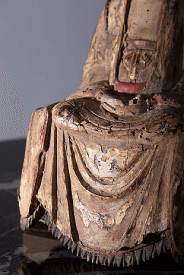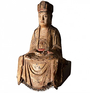 In un regno dove il tempo si è fermato, esiste un capolavoro del '500, una scultura di ineguagliabile bellezza che ti trasporta nel cuore della dinastia Ming. Qui, in un luogo di riverenza e maestria, siede il Bodhisattva cinese Guanyin, l'incarnazione della compassione, racchiuso in una forma di eleganza mozzafiato. La presenza divina di Guanyin viene svelata mentre è seduta in padmasana, la posizione del loto, simbolo di purezza e illuminazione. I suoi abiti regali ricadono con grazia, a testimonianza della squisita abilità artigianale e della devozione ai dettagli della dinastia Ming. L'abito reale drappeggiato lo avvolge come un manto celeste, elevando la sua presenza a una grandezza divina. Con le mani delicatamente appoggiate in grembo, Guanyin assume il dhyanamudra, il gesto della meditazione, invitandoti a partecipare a un momento di serena contemplazione. Il suo volto sereno emana un senso di tranquillità e benevolenza, offrendo conforto a tutti coloro che lo cercano. È come se l'essenza stessa della compassione avesse preso forma e risiedesse in questa scultura sacra. La testa di Guanyin è ornata da una corona radiosa, che simboleggia la sua autorità divina e la sua saggezza spirituale. Ogni dettaglio intricato della corona parla della dedizione della dinastia Ming alla perfezione artistica, gettando un alone luminoso sul volto sereno del Bodhisattva. Ma ciò che contraddistingue questa scultura è la posizione di bellezza che Guanyin incarna. Con il suo portamento aggraziato e la sua bellezza divina, emana un fascino etereo che trascende i limiti terreni. La sua forma irradia una bellezza ultraterrena, affascinando i cuori di tutti coloro che lo osservano. È come se il concetto stesso di bellezza trovasse la sua incarnazione in Guanyin. Al cospetto di questa squisita scultura, non potrai fare a meno di commuoverti per la mescolanza di emozioni di stupore e riverenza. È una testimonianza dell'arte e della spiritualità della dinastia Ming, un pezzo di storia che trascende il tempo e lo spazio. Guanyin, seduto in tutta la sua bellezza, ti invita a testimoniare la compassione e la grazia senza limiti che offre al mondo, un promemoria senza tempo del potere duraturo della bellezza e della compassione.