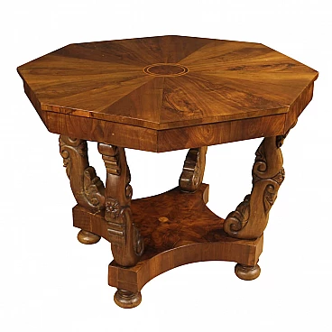 Particolare tavolo da salotto italiano della metà del XX secolo. Mobile scolpito e intarsiato in legni di noce, acero, radica, faggio e legni da frutto di bella linea e piacevole arredamento. Tavolo ottagonale munito di quattro cassetti (vedi foto) di discreta capacità. Piano ligneo in carattere di buona misura e servizio, ideale da inserire in un salotto o studio. Mobile sostenuto da quattro solide gambe finemente cesellate connesse con la base del mobile (vedi foto). In buone condizioni con qualche segno del tempo.