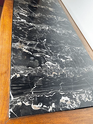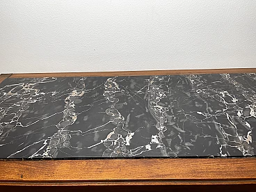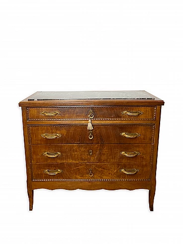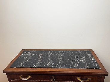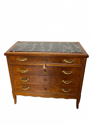 Cassettiera italiana Art Déco degli anni '40. La cassettiera è realizzata in noce, in legno massiccio con maniglie in ottone bachelizzato e il piano in legno è intagliato per l'inserimento di un piano in marmo nero massiccio. Dispone di 4 cassetti spaziosi, con tre chiavi originali. Dettagli decorativi intagliati in ogni cassetto. Otto maniglie in bachelite color ottone, sono presenti minime rotture nella parte finale della prima e della terza maniglia, sul lato sinistro. Aspetto elegante e curato. Questo mobile è stato realizzato su ordinazione dal falegname locale dell'epoca. È stato utilizzato e collocato in un edificio storico di Genova, Italia. Ottime condizioni, nonostante alcuni piccoli difetti dovuti all'età e all'uso. Larghezza 113 cm x Altezza 100 cm x Profondità 50 cm. Prodotto a Genova, Italia negli anni '40.