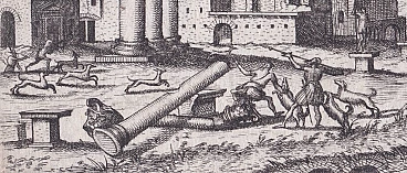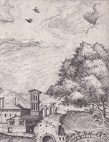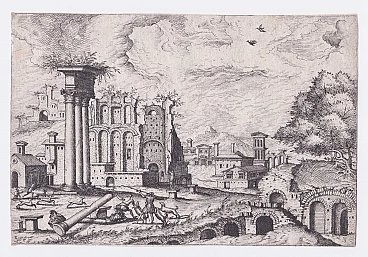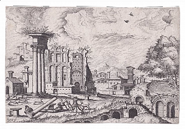Joannes van Doetecum (Deventer 1530 – Haarlem 1605) incisore e calcografo olandese, lavora principalmente nella sua città natale. Ha inciso opere ispirate a scene di genere di Pieter Bruegel il Vecchio e mappe di varie città dei Paesi Bassi. Con il fratello Lucas collabora nella realizzazione di alcune serie. Questa stampa fa parte della serie Operum Antiquorum Romanorum, conosciuta anche con il titolo Il Piccolo libro delle Rovine Romane, derivata da disegni di autore ad oggi anonimo, è stata pubblicata inizialmente ad Anversa nel 1562 da Hieronymus Cock. Si conoscono altre tre edizioni: Amsterdam con indirizzo di Michiel Colijn con tavole nel I stato senza la numerazione; Amsterdam con indirizzo di Corbìnelis Danckerts I; Amsterdam con indirizzo di Frederick de Wit di sole 11 lastre nel II stato con la numerazione 1-12. La serie è composta dal frontespizio e da 2o incisioni raffiguranti animate vedute di antichità romane così come erano visibili all’epoca. In definitiva sono un interessante documento dell’epoca, non tutte le vedute sono riconducibili a località italiane. In questo foglio viene rappresentato il Foro romano quale scenografia per un episodio di caccia: quattro cacciatori seguiti da cani e armati di lance hanno accerchiato tre camosci. Diversamente dalle altre lastre della serie questa è nota in un solo stato, il primo, antecedente la numerazione. Impressione fresca e ben contrastata su carta leggera, il chiaroscuro dona un’atmosfera argentea alla composizione. Ottimo stato di conservazione. Esemplare rifilato alla linea di contorno sempre visibile. Bibliografia: P. Bellini, Dizionario della Stampa d’arte, p 171; New Hollstein 246; J. van Grieken, G.Luijten, J. van der Stock, Hieronymus Cock, The Renaissance in Print, p 102.