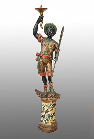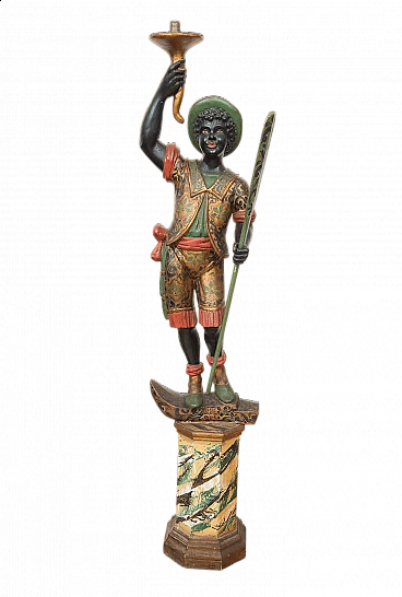 La scultura dalla raffinata esecuzione, raffigurante un giovane africano con in capo un particolare cappello di colore verde. Quest'opera appartiene alla produzione veneziana di inizio novecento a soggetto esotico evocative del passato coloniale della Repubblica Veneta. L'antica statua veneziana raffigurante un moro, simboleggia un servitore che tiene nella mano sinistra un piccolo remo. L'antico moro poggia su una gondola che a sua volta poggia su un basamento di forma ottagonale in legno marmorizzato Buono stato. Provenienza: Venezia XIX secolo. Misure: 40x45 cm, H 155 cm. Certificato di Autenticità. Siamo a vostra disposizione per ulteriori chiarimenti o particolari fotografici. Spedizione in tutta Italia, Europa e resto del mondo a prezzi molto contenuti, in massima sicurezza e tracciabilità. La spedizione sarà concordata privatamente.