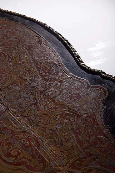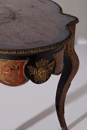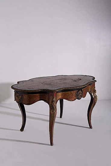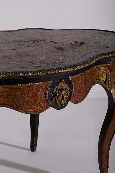 Ammira la squisita bellezza di un'antica scrivania in stile Boulle della fine del XIX secolo, un vero e proprio capolavoro che ha abbellito l'epoca di Napoleone III. Questa scrivania non è solo un mobile, ma un'opera d'arte che ti porta in un viaggio nel tempo, rivelando l'opulenza e la maestria dell'epoca. Dal momento in cui i tuoi occhi si poseranno su di essa, rimarrai ipnotizzato dall'intricata bellezza che ne adorna ogni centimetro. Gli intarsi in bronzo finemente cesellati abbelliscono ogni sezione della scrivania, formando un ricco arazzo di elementi decorativi. La struttura in legno, ebanizzata alla perfezione, mette in mostra la maestria nella creazione di finti motivi tartarugati, a testimonianza dell'abilità dei suoi artigiani. Le gambe della scrivania sono ornate da un motivo a corno, un tocco di eleganza che ne aumenta il fascino. Il piano della scrivania è caratterizzato da un'affascinante motivo ondulato, che ne accentua ulteriormente il fascino visivo. Sulla superficie in legno scoprirai delicati intarsi in bronzo che creano una danza armoniosa tra legno e metallo. Il bordo della scrivania è un tesoro di elementi decorativi, sia in legno che in bronzo, ognuno dei quali testimonia la dedizione ai dettagli. Alle estremità della scrivania, stemmi ed emblemi regali rendono nota la loro presenza, simbolo della sua grandezza e del suo patrimonio. Le gambe stesse vantano elementi in ottone, con figure cherubiche e altri dettagli ornamentali, ognuno dei quali racconta una storia dell'epoca in cui è stato realizzato. Ogni aspetto di questa scrivania, dall'intarsio ai dettagli minuziosi, mette in mostra materiali di altissima qualità e la massima abilità artistica. È una testimonianza della grandezza del suo tempo, un pezzo che trasuda opulenza ed eccellenza artistica. Questa scrivania non è solo un mobile, ma una dichiarazione di gusto raffinato e un legame con la storia. Sia che venga collocato in un ambiente d'epoca che in uno spazio moderno e distinto, irradia eleganza e prestigio. Non si tratta di un semplice oggetto, ma di un'opera d'arte che verrà conservata per generazioni, a testimonianza del fascino duraturo di un'artigianalità e di un design eccezionali.