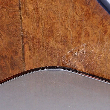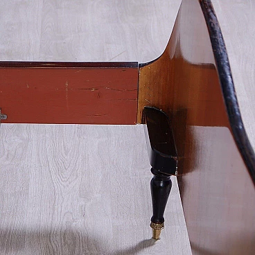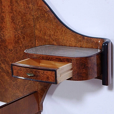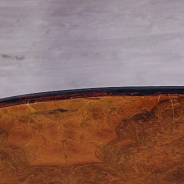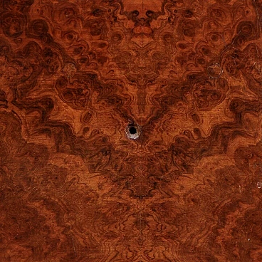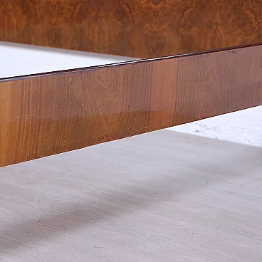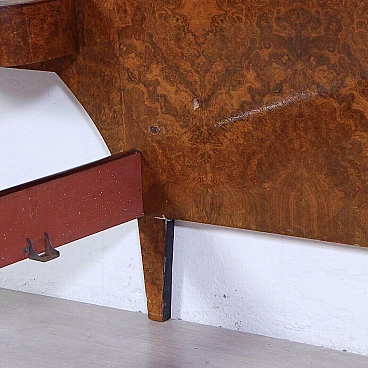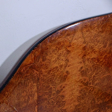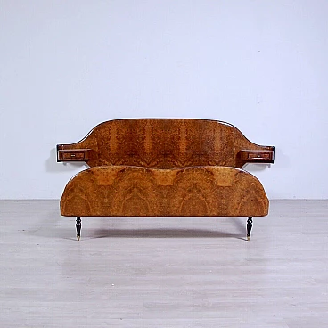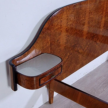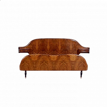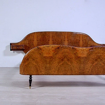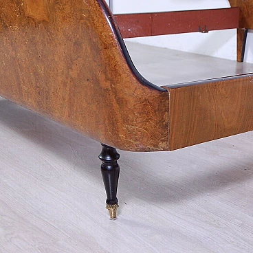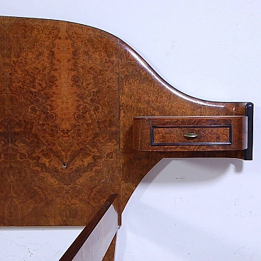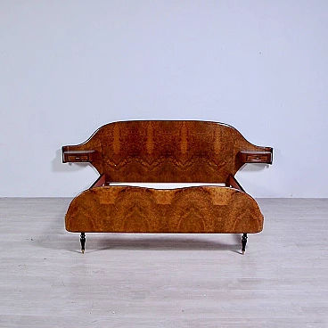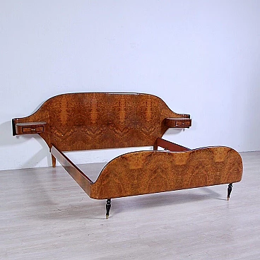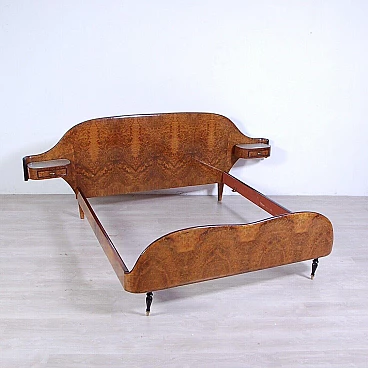 Struttura per letto matrimoniale, è una produzione originale degli anni ’60 e non un rifacimento dei giorni nostri. Realizzata in legno e radica con bellissime marezzature. Forme morbide con finiture curve.