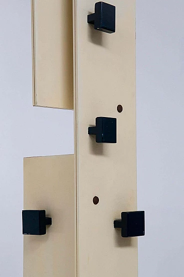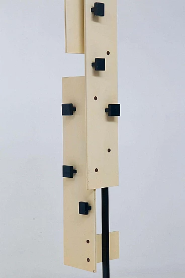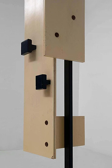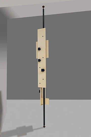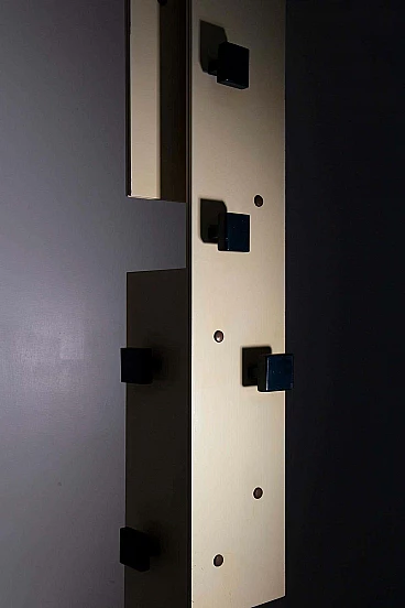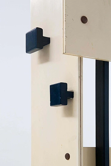 Entra nell'elegante mondo del design italiano degli anni '50, dove forma e funzione si uniscono in un appendiabiti modernista mozzafiato. Questo pezzo notevole è una testimonianza dello spirito innovativo dell'epoca, con un sorprendente gioco di forme geometriche e una costruzione robusta che conquisterà i tuoi sensi. Questo appendiabiti è una fusione armoniosa di geometria e solidità. Realizzato con cura, possiede una struttura in ferro sostenuta da piedi a forma di piattino in ottone lucido. Questi piattini in ottone offrono stabilità e un tocco di eleganza, elevando l'appendiabiti a vera e propria opera d'arte. La magia avviene davvero nella danza geometrica che intreccia. Immagina questo: pareti perpendicolari in legno, dipinte in una rilassante tonalità beige, che formano uno sfondo accattivante. Queste pareti si intersecano in un'ipnotizzante esibizione di angoli, creando uno spettacolo volumetrico che sfida le convenzioni. Quando le tue dita tracceranno la superficie, incontrerai le deliziose manopole blu, disposte con precisione. Questi elementi di forma quadrata non sono solo ornamentali, ma anche funzionali e fungono da robuste mollette per sostenere i tuoi cappotti e accessori. Aggiungono un tocco di colore alla tavolozza di colori tenui, un contrasto sottile ma sorprendente che attira l'attenzione. Ma questo appendiabiti ha qualcosa in più di quello che sembra. Non si tratta solo di un mobile, ma di una dichiarazione, di un elemento di conversazione. Conosciuta come "terra-cielo", sfida la gravità attaccandosi sia al soffitto che al pavimento attraverso i suoi piedi a forma di piattino. Questa è l'innovazione del design al suo massimo, un'incarnazione della ricerca del movimento modernista di superare i limiti. Questo portabiti geometrico si adatta perfettamente a stanze in stile modernista o contemporaneo, aggiungendo un elemento di intrigo e arte al tuo spazio abitativo. Non si tratta di un semplice oggetto, ma di un pezzo di storia, un capolavoro italiano vintage realizzato con precisione e cura. Possedere questo appendiabiti significa abbracciare l'essenza di un'epoca in cui il design era una celebrazione della creatività e della funzionalità. Ci ricorda che anche gli oggetti di uso quotidiano possono essere elevati al regno dell'arte. Porta questo pezzo a casa tua e non acquisterai solo un appendiabiti, ma accoglierai nella tua vita un'opera di design geniale.