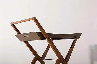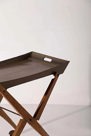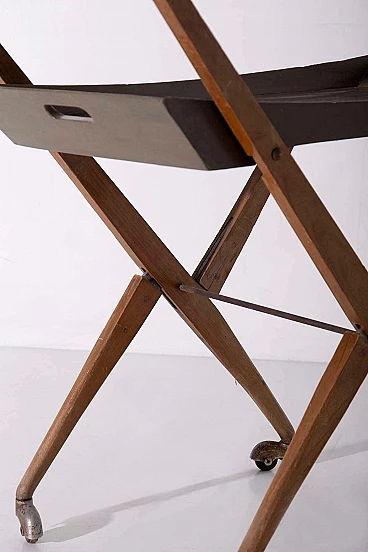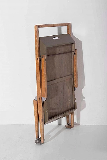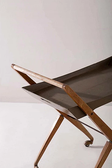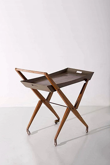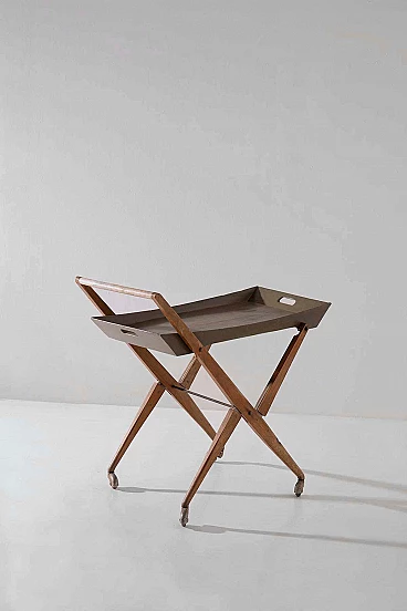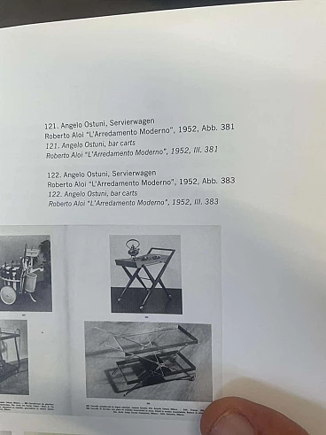 Nel cuore degli anni '50, in mezzo al ricco design dell'artigianato e del design italiano, dalla mente brillante di Angelo Ostuni emerse una creazione straordinaria. È un gioiello raro, testimonianza di un'epoca in cui forma e funzione danzavano insieme in perfetta armonia. Questo non è un normale carrello da bar: è un capolavoro che trascende il tempo. Realizzata con una meticolosa attenzione ai dettagli, questa meraviglia italiana è una vera e propria testimonianza della maestria dell'epoca. La sua superficie in legno, impreziosita da un'impiallacciatura lucida, nasconde un delizioso segreto. Con un leggero strattone, si trasforma senza sforzo in un vassoio da portata portatile, invitandoti a trasportarlo con grazia e raffinatezza.La struttura di questo carrello è uno studio di eleganza geometrica. Le sue linee pulite e minimaliste sono la quintessenza di Ostuni e testimoniano la sua particolare sensibilità progettuale. Ma c'è di più in questo carrello di quanto non sembri. Possiede un segreto salvaspazio, un talento nascosto che lo fa ripiegare quando non viene utilizzato, rendendolo l'emblema della praticità. Le sue ruote in metallo scorrono dolcemente, a testimonianza della sua funzionalità e mobilità. Ogni giunzione è impreziosita da elementi in ottone, a testimonianza della meticolosa lavorazione artigianale che ha portato alla sua creazione. È un pezzo che sussurra le storie degli artigiani che hanno faticato per dargli vita. Questo carrello non è solo un raro pezzo di design: è un frammento tangibile della storia italiana del mid-modern. È una finestra su un'epoca in cui l'innovazione e l'estetica si fondevano in oggetti che continuano a ispirare e affascinare. Questa straordinaria creazione è entrata a far parte degli annali della storia del design, arrivando persino sulle pagine de "L'arredamento Moderno" di Roberto Aloi. Possedere questo squisito carrello da bar significa possedere non solo un mobile, ma anche un'opera d'arte. È un viaggio emotivo nel tempo, un'occasione per rivivere l'eleganza e la raffinatezza di un'epoca passata. Questo non è solo un pezzo di storia: è una testimonianza del fascino duraturo del design italiano, un tesoro senza tempo che continuerà a incantare le generazioni a venire.