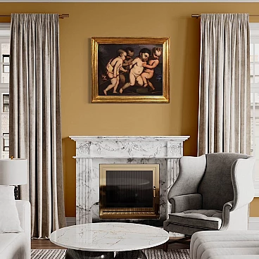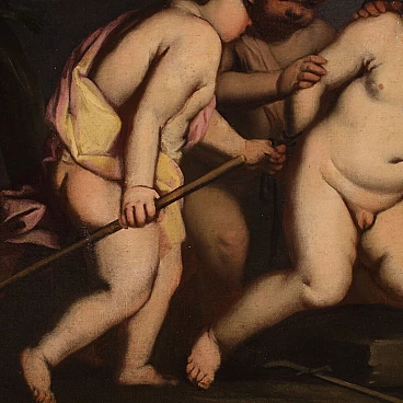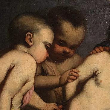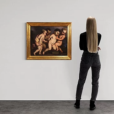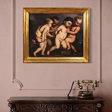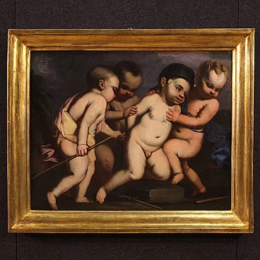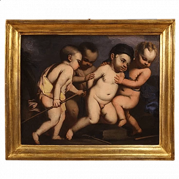 Antico dipinto italiano della prima metà del '600. Opera a olio su tela raffigurante un soggetto allegorico, in particolare un gioco di putti, di ottima mano pittorica. Quadro di bella misura e proporzione adornato da cornice lignea non coeva dell'800, scolpita e dorata (doratura ripresa nel '900). Dipinto che si sviluppa in orizzontale dal particolare soggetto, infatti i putti si dilettano nel gioco della guerra con soldati, prigioniero e finte spade di legno abbandonate ai loro piedi (vedi foto). Opera di grande qualità pittorica, da notare come i personaggi siano distribuiti su diversi piani prospettici della composizione; inoltre la realizzazione degli incarnati e il sapiente utilizzo del chiaroscuro denotano una grande maestria. Quadro attribuibile al pittore partenopeo Massimo Stanzione (1585-1656); mancante di documentazione aggiuntiva. Dipinto che ha subito un intervento di restauro conservativo, rintelo, sostituzione del telaio e ripresa del colore in alcuni punti (vedi foto). Nel complesso in buone condizioni. Misure senza cornice: 64 x 81 cm.