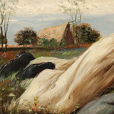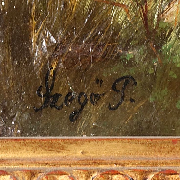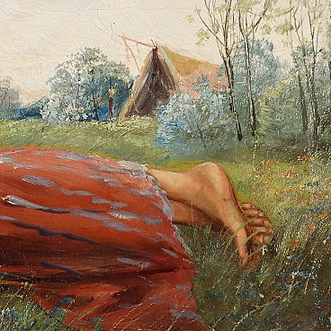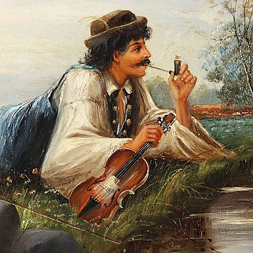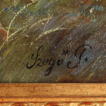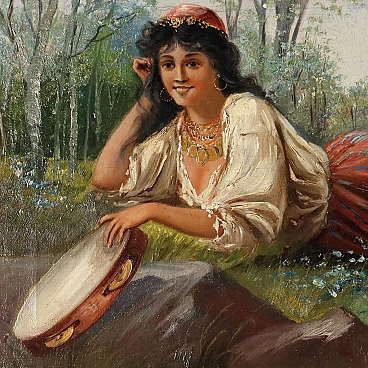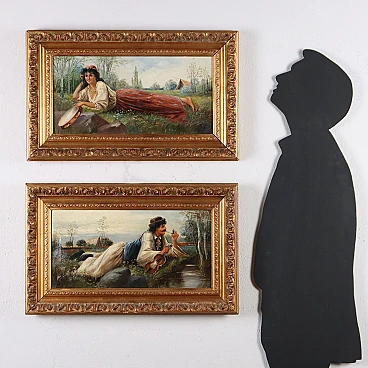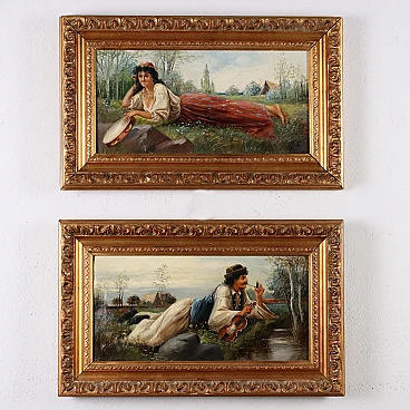 Coppia di dipinti a olio su tela di scuola dell'Europa dell'est raffiguranti una coppia di innamorati gitani, '800 - '900. Firmati "Szego G." in basso. Si tratta di due opere da proporre allineate perché raffigurano un ragazzo e una ragazza stesi sullo stesso prato in posizione speculare, come se si fronteggiassero, intenti probabilmente in un gioco amoroso. Essi indossano abiti gitani e hanno con sé strumenti musicali - lei un tamburello e lui un violino - che rimandano a due personaggi di etnia slava, del mondo gitano. L'insieme risulta vivace e sereno. Eseguito intervento di restauro al quadro con soggetto femminile, per piccolo taglio al centro. Le due opere sono presentate in cornici in stile. Misure senza cornice: 33 x 59 cm.