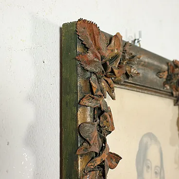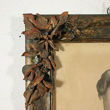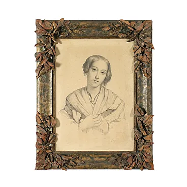 Disegno a matita su carta raffigurante il ritratto di una giovane donna, '800. Buon utilizzo del tratteggio e del chiaroscuro, a proporre un ritratto di giovane popolana efficace ed espressivo. Il ritratto è presentato in cornice ottocentesca lignea, abbellita da inserti in cuoio a foggia di foglie e fiori, con alcune piccole cadute e mancanze. Misure senza cornice: 47,5 x 34 cm.