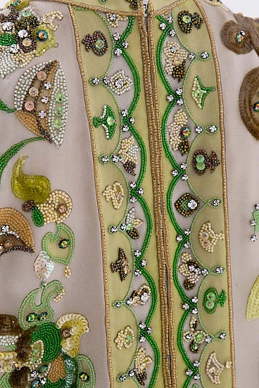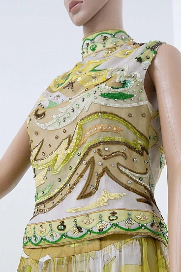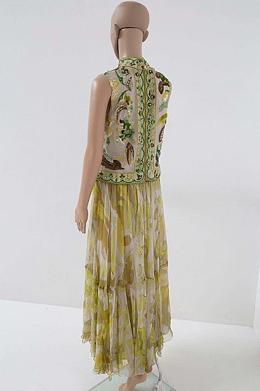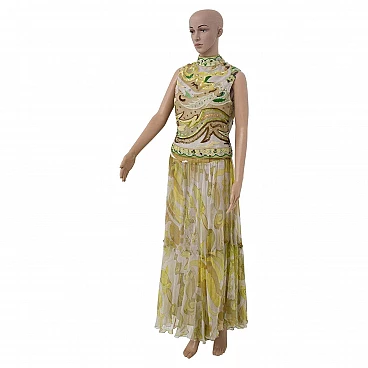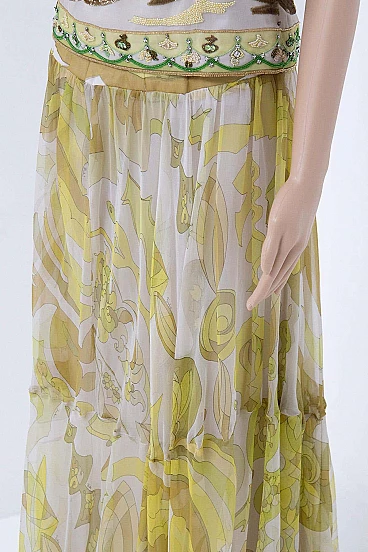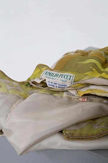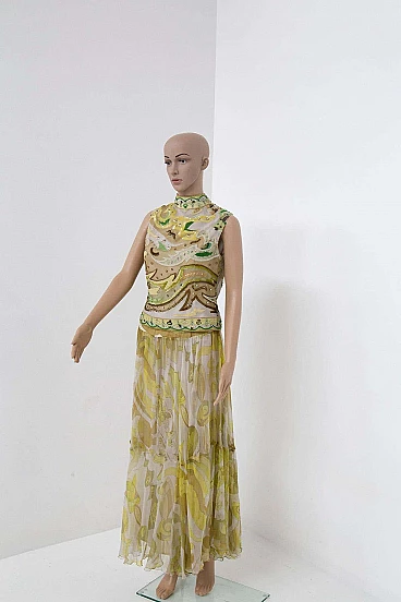 In un mondo di eleganza senza tempo e fascino vintage esiste uno straordinario abito da sera a due pezzi di Emilio Pucci che testimonia l'impareggiabile abilità dello stilista. Con sfumature di giallo e verde che evocano le tonalità vibranti di un giardino estivo, questo abito è un capolavoro che ha superato i confini del tempo. Firmato. La gonna, realizzata in seta finissima, scende come una dolce cascata di tessuto, con i suoi volant che sussurrano dolcemente mentre ondeggiano a ogni passo. È una danza di lusso e grazia, una vera incarnazione della raffinatezza che rimanda a un'epoca di raffinatezza e glamour. Ma è il corpetto che ruba davvero i riflettori, ornato da un'ipnotica tappezzeria di paillettes e cristalli che catturano la luce in uno spettacolo abbagliante. Gli strass con paillettes si uniscono per formare un motivo ornato, un'opera d'arte che racconta una storia di opulenza e splendore. Questo ensemble a due pezzi, una reliquia dell'alta moda vintage, non è un semplice abito, ma una sinfonia di artigianato e creatività. Parla di un tempo in cui la moda era un'espressione d'arte, una dichiarazione di individualità e una celebrazione della bellezza. Ogni punto, ogni paillettes e ogni cristallo è una testimonianza della dedizione e dell'abilità degli artigiani che hanno dato vita a questo capolavoro. Passando le dita sul tessuto, puoi percepire la storia e l'eredità che questo abito porta con sé. La sua eleganza è senza tempo, il suo charme è intramontabile e la sua montatura taglia 12 (42 IT) è una tela su cui chi la indossa può dipingere la propria storia di grazia e fascino. Abbracciando questo abito, diventerai l'incarnazione vivente di un'epoca passata, una visione di raffinatezza che cattura l'essenza dell'eredità di Emilio Pucci. Non è solo un capo d'abbigliamento: è un'opera d'arte, un ricordo di glamour e un invito a entrare in un mondo in cui ogni momento è un affare elegante.
