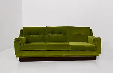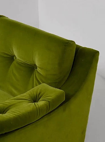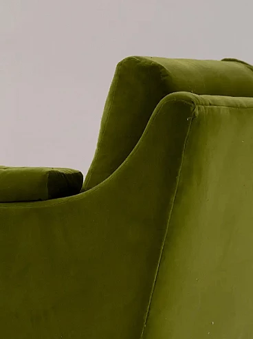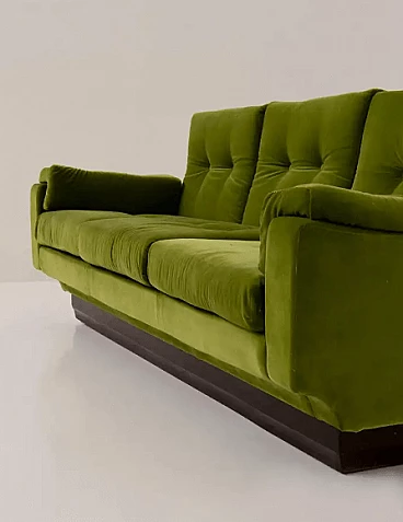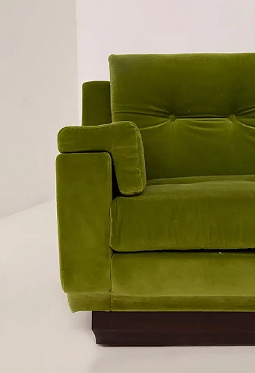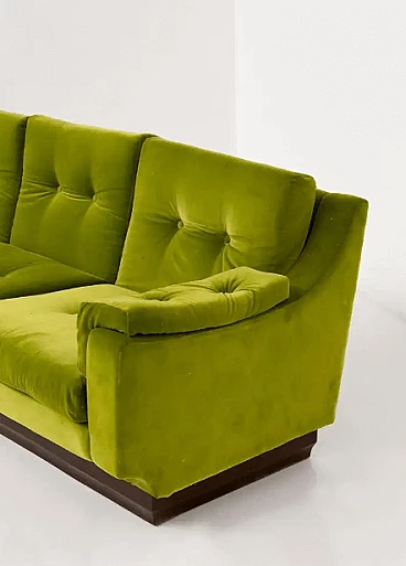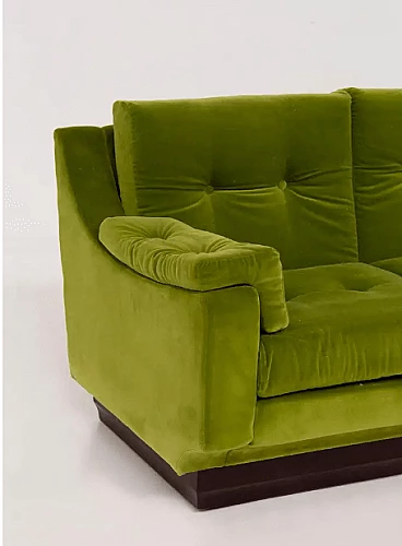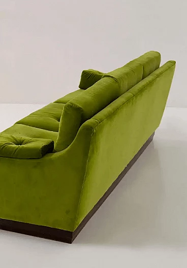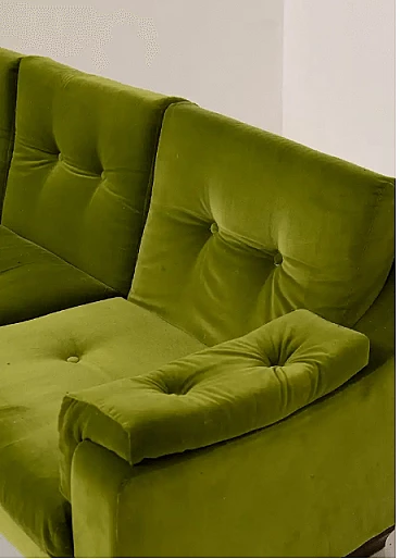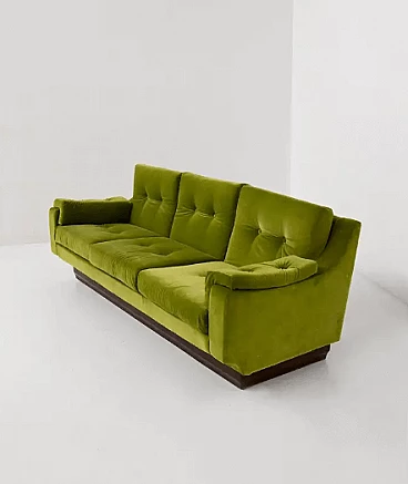 Il rivestimento in velluto verde pastello, recentemente rinnovato, abbraccia questo divano con irresistibile eleganza.
