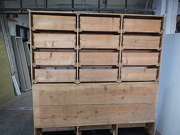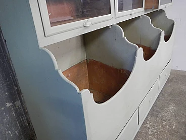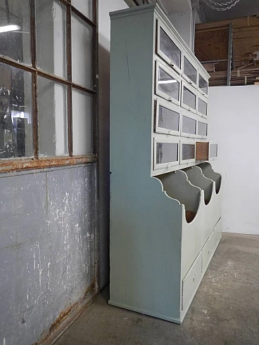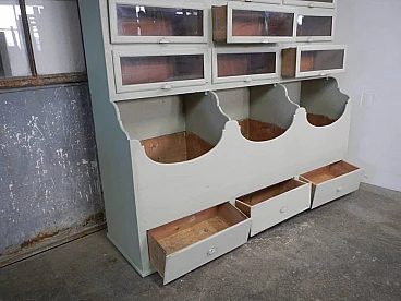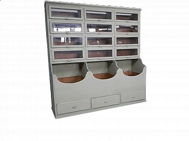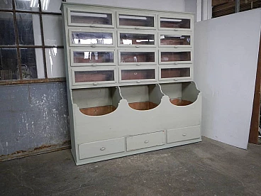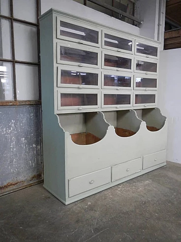 Cassettiera da negozio in abete verde chiaro e vetro, anni '50