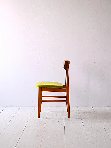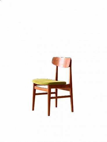 Sedia danese in teak e tessuto verde, anni '60. Sedia originale scandinava dalle linee semplici ed eleganti. Costituita da una struttura in legno di teak, si distingue per la forma sagomata dello schienale. La seduta è imbottita ed è stata rifoderata con tessuto color verde (tessuto Acquaclean resistente alle macchie). Da abbinare sia a un tavolo moderno che a uno contemporaneo. È stato fatto un restauro conservativo con prodotti di origine naturale. Può presentare dei segni del tempo. Per piacere prestare attenzione alle fotografie.