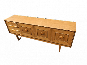 Credenza midcentury in teak, di provenienza inglese, tre cassetti più tre ante di cui una a ripiano. Molto piacevole la linea delle maniglie e delle gambe a forma di U. Perfettamente restaurata.