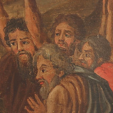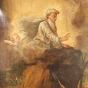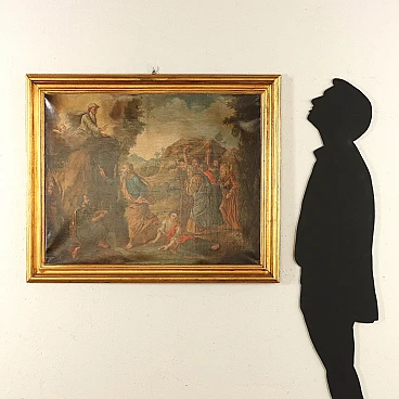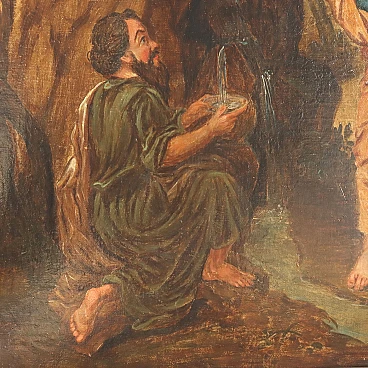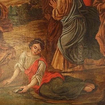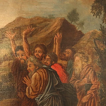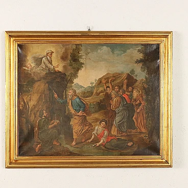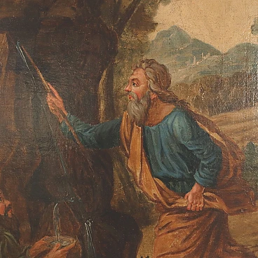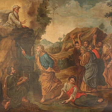 Olio su tela. La scena racconta l'episodio biblico del Libro dell'Esodo, in cui Mosè prega il Signore di aiutare il popolo d'Israele che, in fuga dall'Egitto, si ritrova nel deserto del Sinai senza cibo e senza acqua: nel dipinto è ripreso il miracolo dell'acqua, che Mosè fa scaturire da una roccia, sotto lo sguardo di Dio e mentre il popolo assiste sorpreso e inneggiante. L'ambientazione della scena è in realtà in un paesaggio verdeggiante, qual era quello dell'artista, mentre le figure sono in abiti orientali. Il dipinto, restaurato e ritelato, è presentato in cornice in stile.