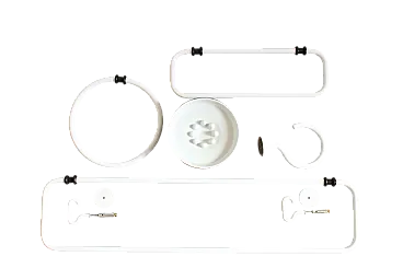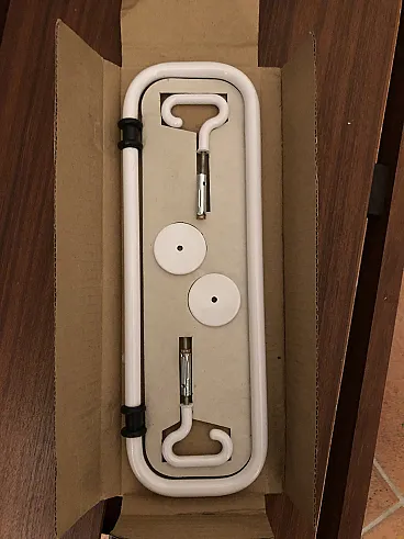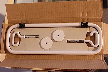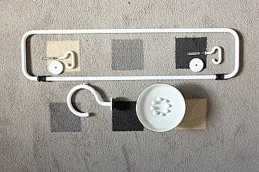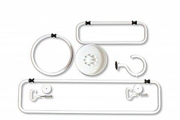 Set accessori da bagno design Sergio Mazza, per Artemide, composto da, porta sapone, porta salvietta tondo diametro 20 cm, porta salvietta da 34 cm, porta salviette da 62cm, e due porta salvietta da 65cm. Nuovi con imballi originali.
