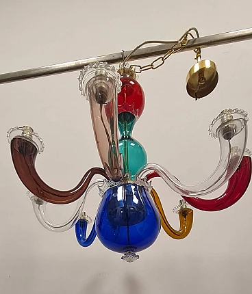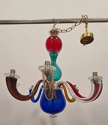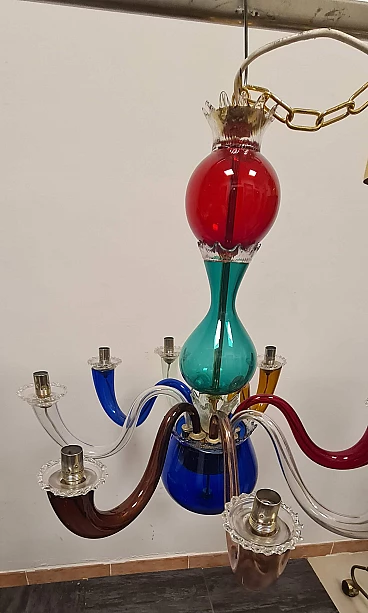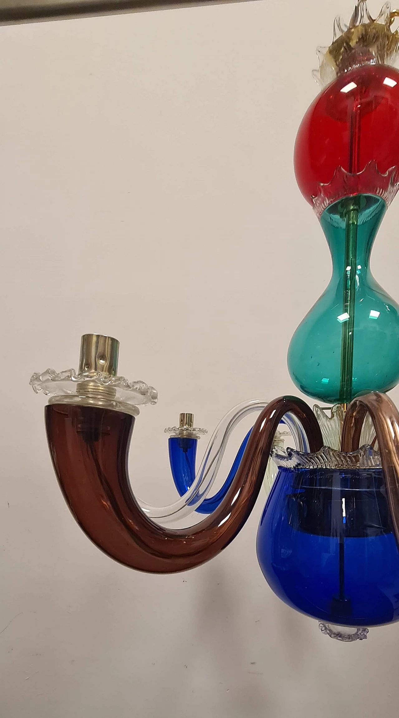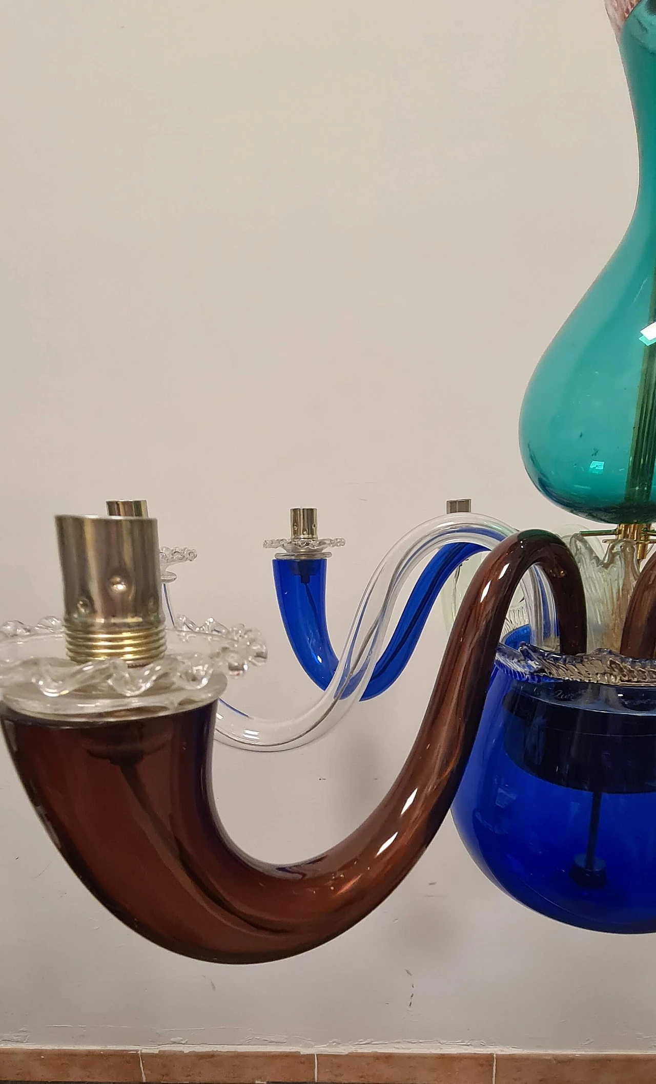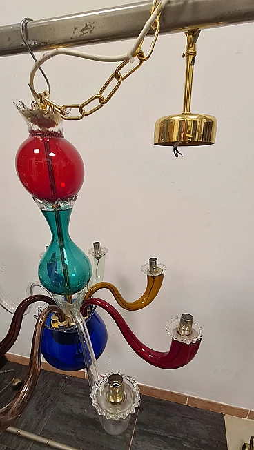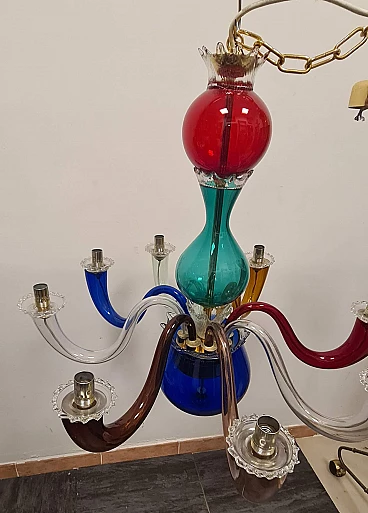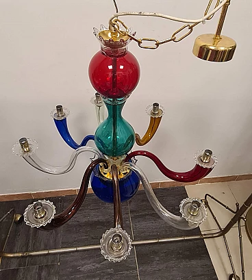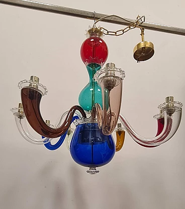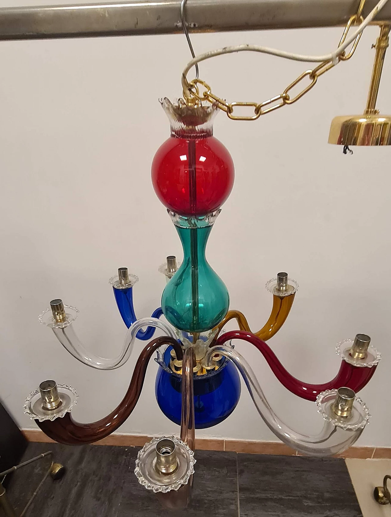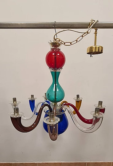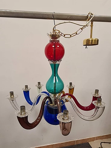 Lampadario a otto braccia in vetro trasparente policromo e scheletro in ottone, fu' realizzato negli anni 70' su disegno di Gio Ponti del 1946.