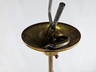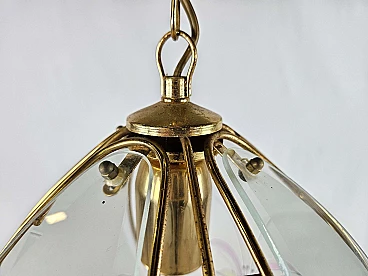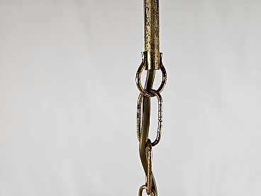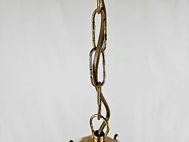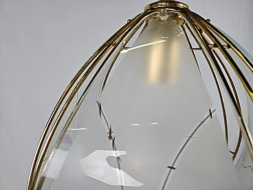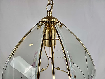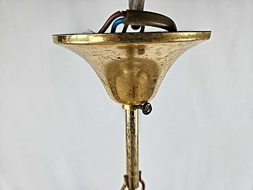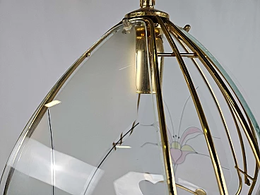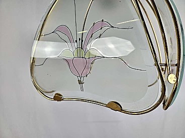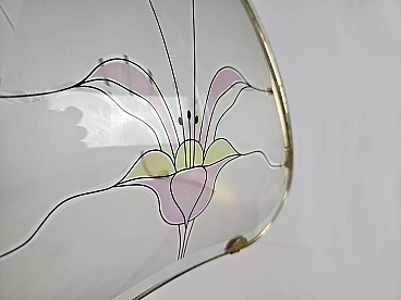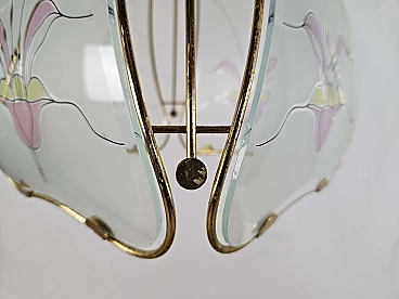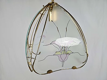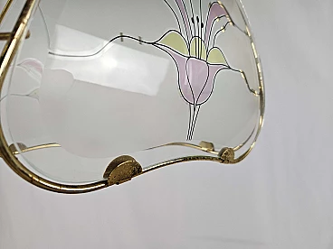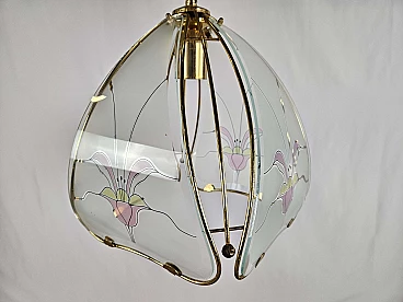 Lampadario in ottone e vetro satinato con decori floreali, anni '70