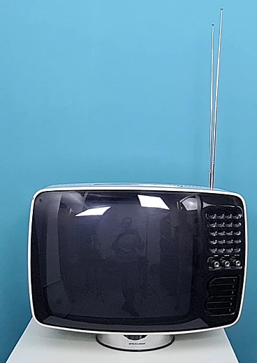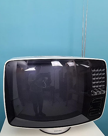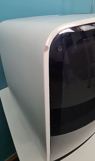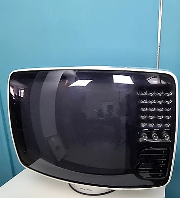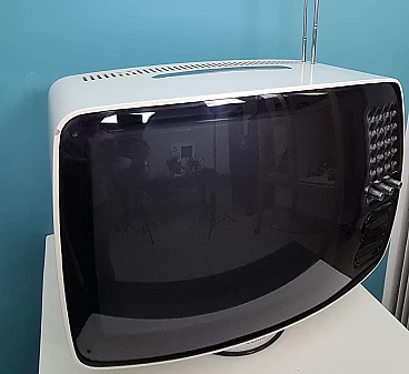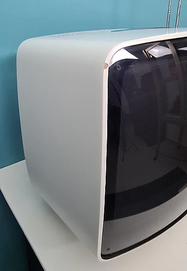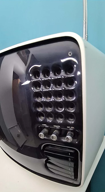 Televisore Volans 17'' disegnato da Mario Bellini per Brionvega, progettato nel 1969. L'apparecchio è in materiale plastico ABS di colore bianco con profili arrotondati e smussati poggiante su uno zoccolo cilindrico cromato. Il cinescopio da 17 pollici con deflessione a 110° è incassato nella scocca in plastica. A destra dello schermo è inserito l'altoparlante ellittico protetto da una griglia in plastica nera.