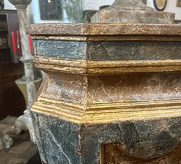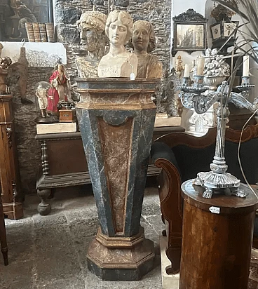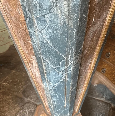 Due colonne in legno laccato blu, marrone e oro, realizzate artigianalmente in Italia alla fine del XIX secolo, si trovavano in un palazzo nobiliare siciliano ai quattro angoli di un grande salone; le colonne disponibili sono 4 e vengono vendute in coppia. Presentano caratteristiche associate all'estetica del design Luigi XVI, emersa alla fine del XVIII secolo durante il regno di Luigi XVI di Francia. Questo stile è caratterizzato da un allontanamento dalla stravaganza del periodo rococò, abbracciando influenze neoclassiche, simmetria e raffinata eleganza. Il legno laccato effetto finto marmo presenta consistenti segni d'uso e d'età. Questa finitura non solo aggiunge un tocco estetico, ma protegge anche il legno. Le colonne hanno un senso generale di grazia ed eleganza, la loro costruzione riflette un alto livello di abilità e attenzione ai dettagli.