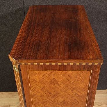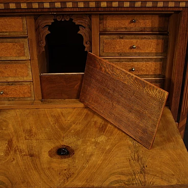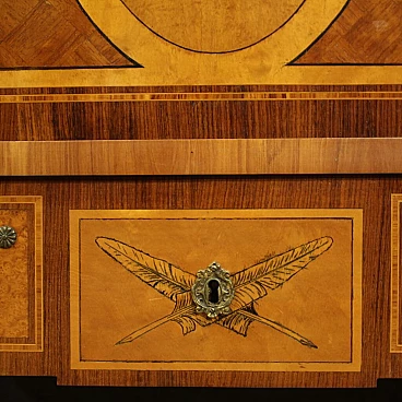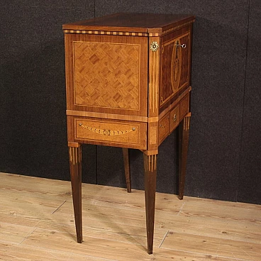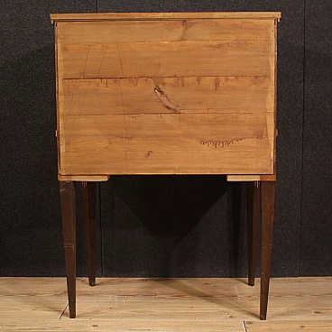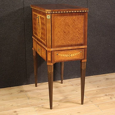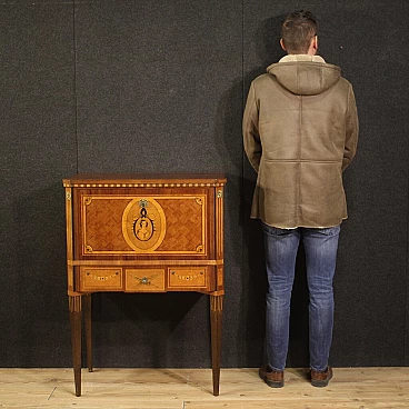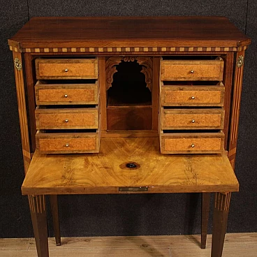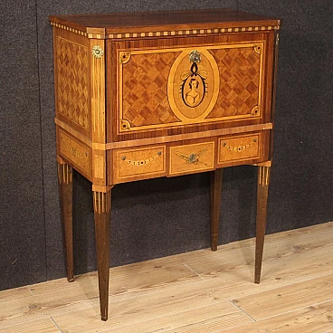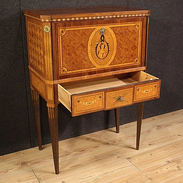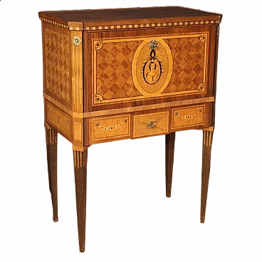Secretaire olandese della seconda metà del XX secolo. Mobile in stile Luigi XVI piacevolmente intarsiato in legni di noce, palissandro, acero, bois de rose, mogano, radica, legno ebanizzato e legni da frutto. Secretaire a gamba alta munito di un cassetto frontale e calatoia (vedi foto). Interno completo di otto cassettini, un vano a giorno e capiente segreto (vedi foto). Piano scrittoio con una macchia centrale con piccola mancanza di impiallacciatura (vedi foto). Mobile sorretto da quattro gambe a tronco di piramide rovesciata, piano superiore ligneo con qualche piccolo segno di usura (vedi foto). Secretaire di ottima proporzione e piacevole arredamento, adornato frontalmente da figura femminile intarsiata sulla calatoia. Presenta qualche segno del tempo, strutturalmente sano e completo di chiave funzionante per entrambe le serrature. Nel complesso in discreto stato conservativo.
