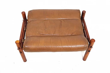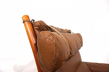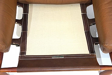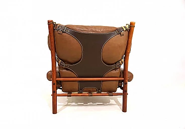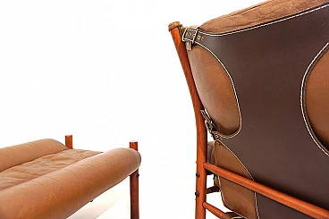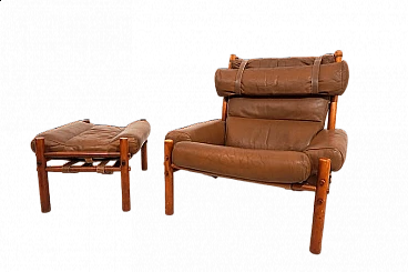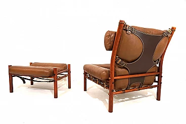 Questa poltrona Inka con pouf in pelle anilina color caramello con pelle resistente marrone scuro sullo schienale è in condizioni eccellenti. La pelle originale della poltrona e del pouf è impeccabile, tutte le chiusure e le cinghie di cuoio sono presenti e funzionano perfettamente. Il paranuca può essere regolato su due lunghezze. La struttura in legno di faggio color teak presenta solo lievi segni di usura. Il famoso designer svedese Arne Norell ha progettato la sedia Inka nel 1968 per la Möbelmanufaktur Norell AB, da lui fondata nel 1954. Ha creato un design di poltrona che fa ancora scalpore e che è diventato un classico assoluto del design dell'arredamento.