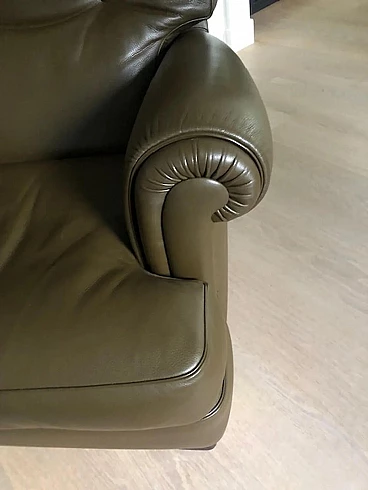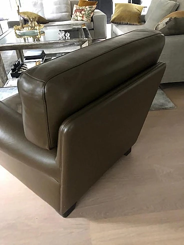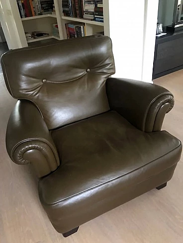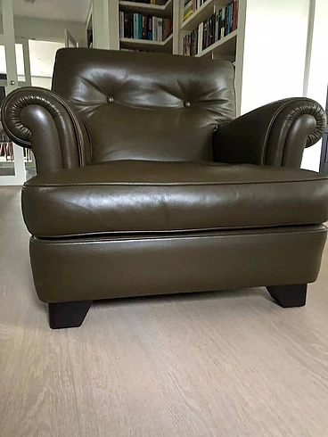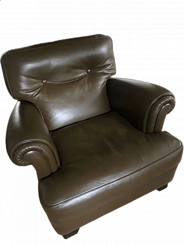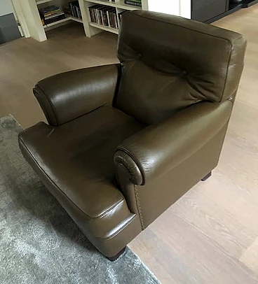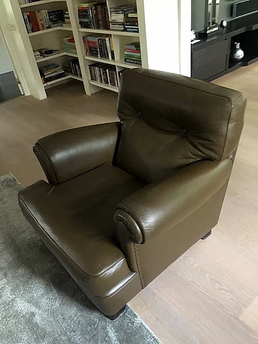 Poltrona Dream On di Renzo Frau per Poltrona Frau. Poltrona dai dettagli curatissimi della collezione storica Frau. Sapienza artigiana tra i massimi livelli. La poltrona è del 2013. In condizioni molto buone con minimi segni. Seduta estremamente confortevole, cucita a mano. La struttura è in massello di faggio, l'imbottitura per i cuscini del sedile è in crine di cavallo gommato e poliuretano, i braccioli curvi sono realizzati in schiuma di poliuretano modellata, le gambe sono in legno di faggio tinto; il rivestimento, i cuscini della seduta e quelli dello schienale con trapunta a doppio bottone e le bordature sono in pelle toscana primo fiore in marrone Nest finitura Fango.