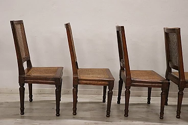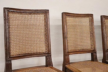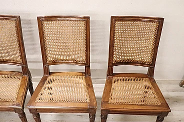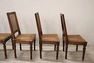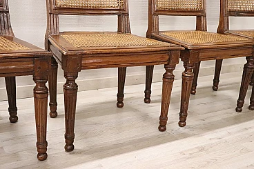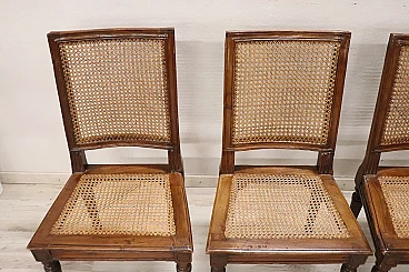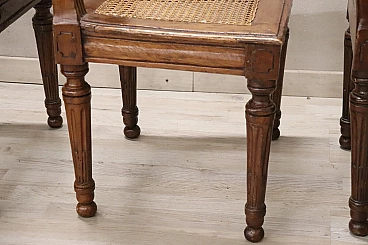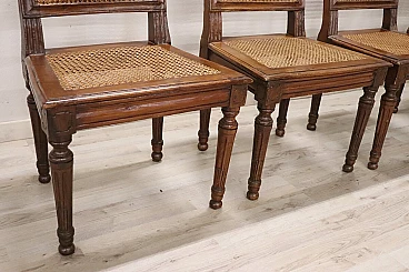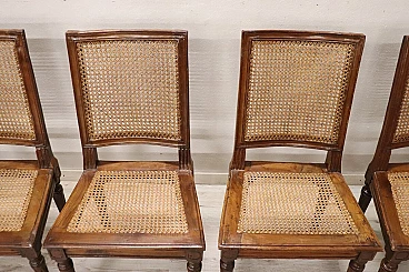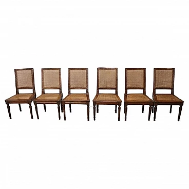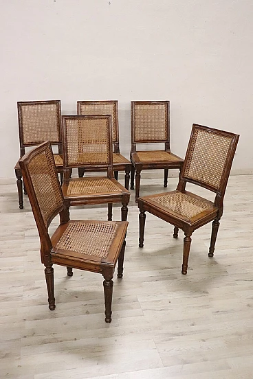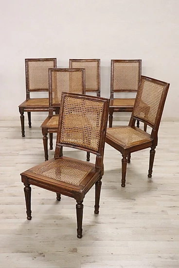 Rarissima serie di sei sedie da pranzo antiche ebanisteria italiana di piena epoca Luigi XVI, secolo XVIII. Caratterizzate da uno schienale lineare e da solide gambe a spillo con motivo scanalato. Realizzate in pregiato legno di noce massello. Di grande pregio l’originale paglia di Vienna sullo schienale e sulla seduta realizzata con l’antico metodo dell’intreccio a mano. Seduta ampia e confortevole. Queste sedie antiche sono perfette per impreziosire il vostro salotto di prestigio. Dotate di un comodo cuscino personalizzato fatto a mano e rivestito in raffinato velluto verde oliva. Si consiglia di utilizzare il cuscino per preservare l’alta qualità della lavorazione della paglia di Vienna. L’altezza della seduta con il cuscino è di 47 cm. In perfetto stato di conservazione del legno e della paglia. Prezzo trattabile vi invitiamo ad inviarci le vostre proposte di acquisto, le valuteremo con piacere. Vi consigliamo comunque di guardare bene in dettaglio tutte le foto allegate. Larghezza 51 cm, profondità 52 cm, altezza 92 cm, altezza della seduta 42 cm, altezza della seduta con il cuscino è di 47 cm. Imballo professionale, spedizioni assicurate con corrieri, consegna su appuntamento solo su piano strada, no facchinaggio ai piani.