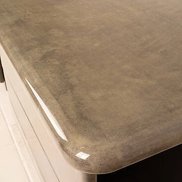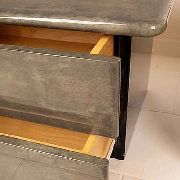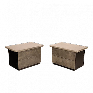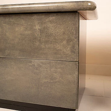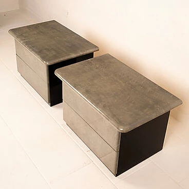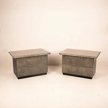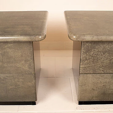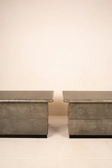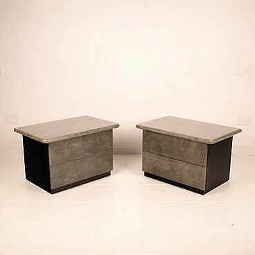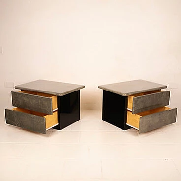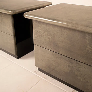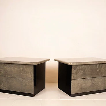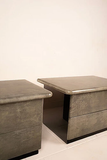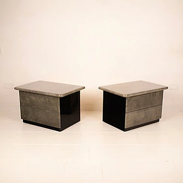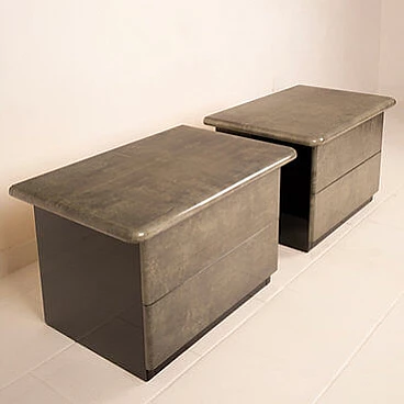 Coppia di comodini in pergamena color grigio verde disegnata da Aldo Tura e prodotta da Tura Milano negli anni '70. Rarissimi in questo colore che gli dona una bellezza difficile da rendere con giustizia anche in fotografia, la patina e la texture della pelle è straordinaria e viene abbinata con laterali in lacca nera lucida che gli danno grande eleganza. Questa stupenda coppia di comodini rappresenta un'opera senza tempo e una testimonianza della massima eccellenza artigianale italiana degli anni '70. E' possibile abbinare i comodini anche alla Cassettiera appartenente alla stessa serie. In condizioni perfette, come documentato dalle fotografie. Rinnova il tuo spazio con questa coppia di comodini, simbolo di artigianato e design d'eccellenza.