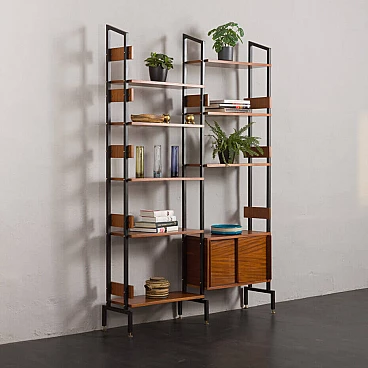 Questo sistema di scaffalatura comprende: un mobile con due ante scorrevoli - H: 40/ L: 68/ P: 34 cm, 8 ripiani - L: 69 / P: 30 cm, 9 pannelli laterali, 3 scaffali in acciaio, ferramenta in ottone. Dimensioni complessive del pensile - H: 224 / L: 147 / P: 34 cm. Ottime condizioni originali d'epoca con lievi segni di usura. Il legno è stato pulito e preservato con composti professionali. Le guide sono state rinfrescate.