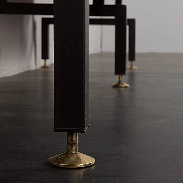 Il mobile e gli scaffali in noce sono montati su ripiani in acciaio verniciato nero con piedini regolabili in ottone. I piedini, regolabili in altezza, assicurano la stabilità del pensile anche su pavimenti irregolari. Questa scaffalatura modulare presenta un design italiano moderno e minimalista con dettagli sottili ed è adatta sia per l'ufficio che per il soggiorno.