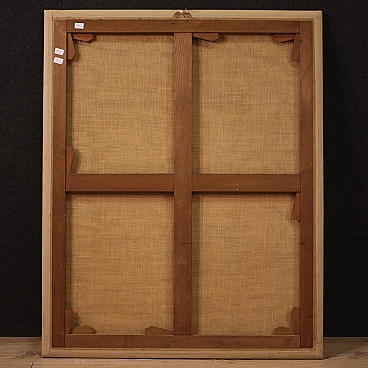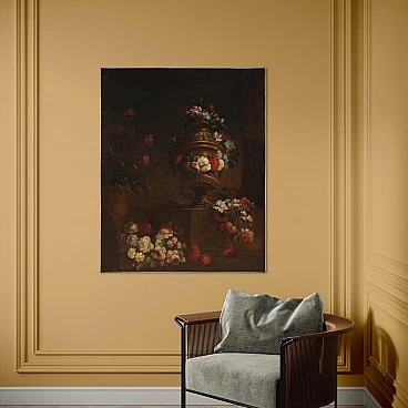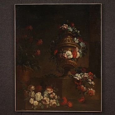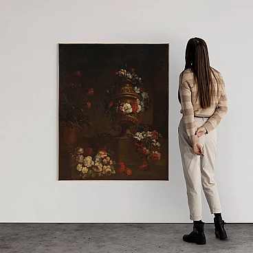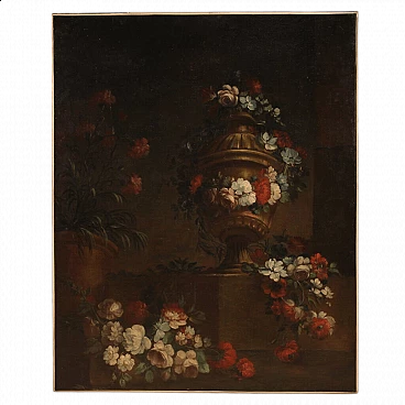 Dipinto italiano della prima metà del '700. Opera a olio su tela raffigurante una grande natura morta con fiori, di ottima mano pittorica. Quadro che si sviluppa in verticale, caratterizzato da un fondo scuro che crea un piacevole e intenso contrasto con i colori accesi dei fiori. Imponente il grande vaso adornato da una ghirlanda floreale. Opera di bella misura ideale da inserire in un salone, salotto o studio, di grande eleganza. Dipinto che ha subito un intervento di restauro con rintelo, sostituzione del telaio e ripresa del colore in alcuni piccoli punti (vedi foto). Nel complesso in buono stato conservativo.