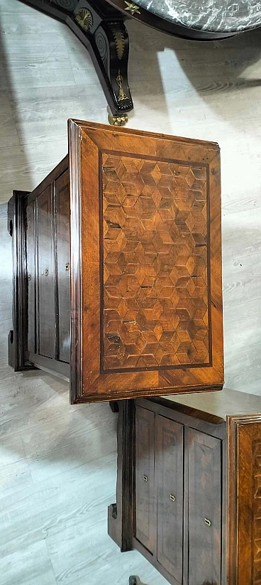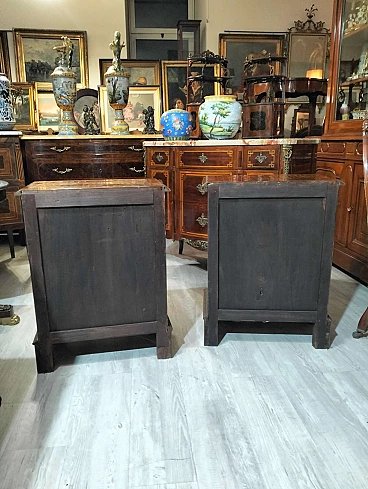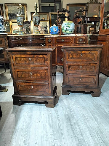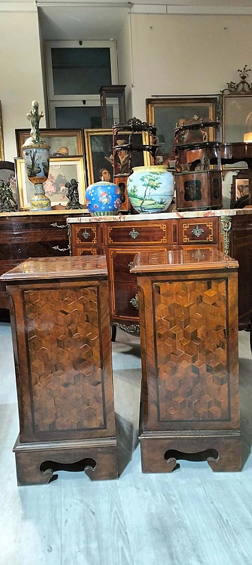 Coppia di comodini in noce con intarsi a scacchiera, inizio '900