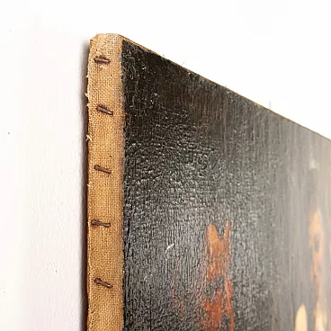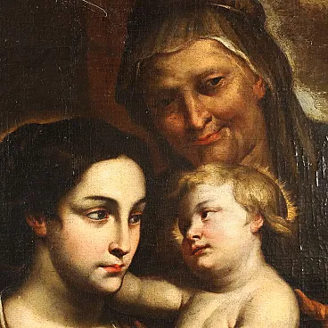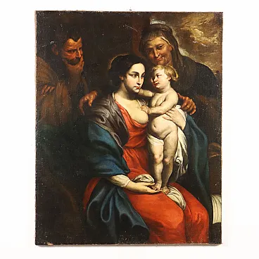 Olio su tela. Il dipinto deriva dall'opera di Rubens (1577-1640) conservata al Museo del Prado a Madrid, riprodotta in controparte in incisione da Paulus Pontius (1603 -1658), come appare anche in questa versione. Occupa il centro verticale della scena la figura di Maria, il cui volto fu ispirato a quello di Isabel Brandt, la prima moglie del pittore fiammingo, morta nel1626 ad appena 35 anni. La Madonna tiene in braccio il Bambin Gesù, che la guarda teneramente ma seriamente negli occhi, mentre una manina è poggiata sul seno scopero della madre, da cui ha appena ricevuto nutrimento; dietro, in piedi, Sant'Anna avvolge le spalle della figlia e del nipote in un tenero e protettivo abbraccio, sorridendo compiaciuta. Sul lato sinistra, un po' separato e al buio, Giuseppe assiste pensoso e preoccupato: unica figura umana che non rientra nella luce emanata dal volto del Bambino, irradiata su quello di Maria e, di riflesso, anche su quello di Sant'Anna. Rispetto all'opera del maestro, è rispettata la composizione delle figure, ma variano diversi particolari, in particolare nelle vesti di Sant'Anna, di Maria, nel drappeggio che cinge i fianchi del Bambino., ad avvalorare l'ipotesi che si tratti di opera di seguace del maestro fiammingo. Il dipinto, restaurato e ritelato, si presenta in buone condizioni, con solo un graffio nel colore in alto al centro.