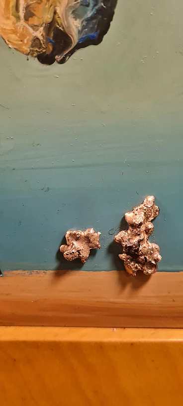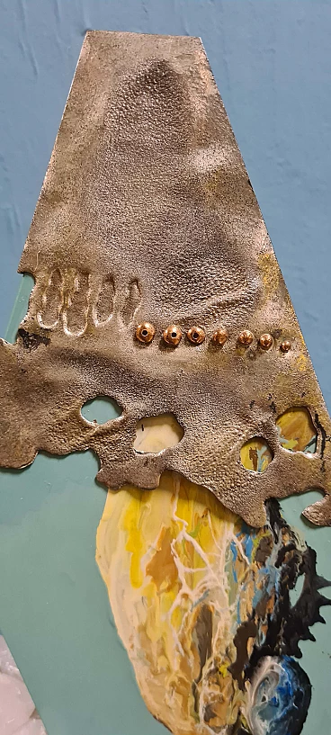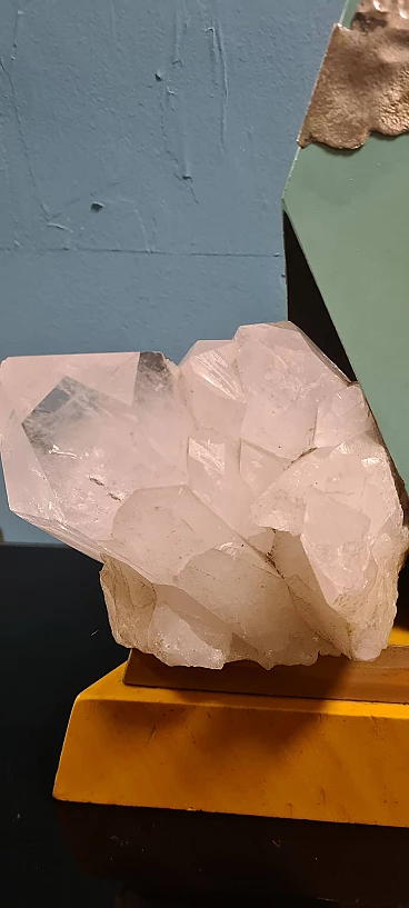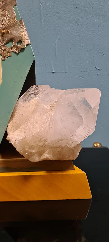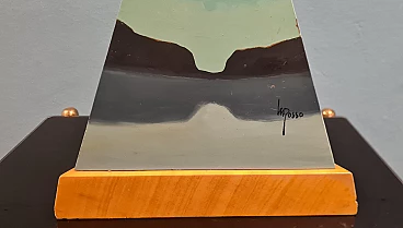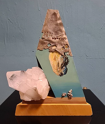 Scultura metafisica realizzata dall'artista Mario Rosso tra gli anni '70 e gli anni '90. Presenta una base triangolare in legno su cui svetta una piramide di metallo dipinta e decorata con argento e un grande cristallo di quarzo. Il dipinto in stile metafisico sulla scultura raffigura un paesaggio desertico con delle rocce che vengono fatte discendere dal cielo anziché dalla terra. La pittura metafisica, corrente pittorica d'avanguardia diffusa praticamente solo in Italia, rappresenta gli oggetti in maniera nitida e statica ma andando oltre il loro aspetto meramente fisico-realistico. Di forte impatto e riflessione, la scultura è un oggetto curioso ed è l'ideale per donare particolarità ai propri ambienti. Nonostante sia presente la firma, sull'artista non si hanno ancora nozioni rilevanti che lo possano collocare in un periodo e ambito specifico. Sono anche presenti sotto la base un timbro della Galleria di Arte di provenienza e un'etichetta con scritto "Misani Gioielli", probabilmente l'esecutore dell'applicazione dei dettagli in argento.