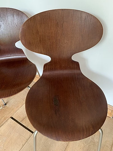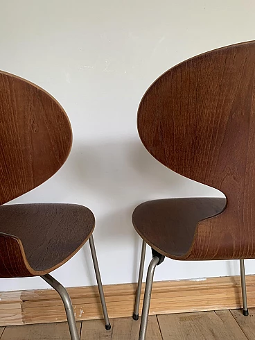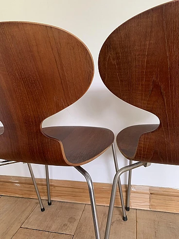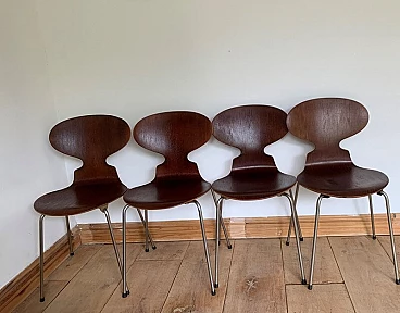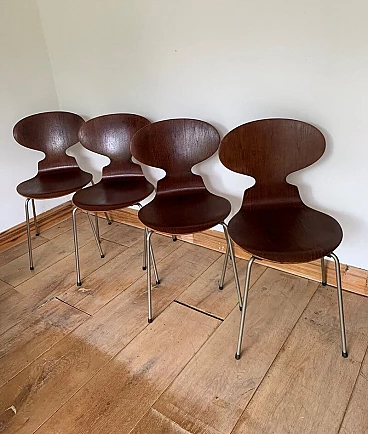 Set di quattro sedie mod. ANT 3101 di Arne Jacobsen per Fritz Hansen, 1971. Disegnate nel 1952, prodotte nel 1971. È stata progettata per la mensa dell'azienda farmaceutica danese Novo Nordisk. Il nome "ANT" è dovuto alla sua approssimativa somiglianza con la sagoma di una formica con la testa sollevata. Hanno più di cinquant'anni e sono in condizioni molto buone con normali e contenuti segni del tempo. Struttura in legno curvato in colore marrone teak scuro, leggera patina dell'epoca sulla parte metallica delle gambe. Icona intramontabile per gli amanti delle opere di Jacobsen. Altezza della seduta: 44 cm.