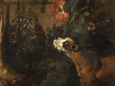 Dipinto a olio su tela attribuito a Jan Weenix (1640/41-1719) raffigurante una natura morta con cane, '600. La scena si svolge in un cortile circondato da un muro. Un segugio bruno sembra controllare il risultato della battuta di caccia da poco conclusa, osservando attentamente la zampa di una lepre appesa al muro dipinta a fianco a due uccelli esanimi. Sopra la testa del cane si sviluppa un cespuglio verde con due gerbere rossastre magnificamente fiorite con petali sfilacciati. Dall'altra parte del muro si snoda un paesaggio boschivo immerso in un cielo serale. Dipinto sottoposto a parziale restauro, lievi ritocchi. Il dipinto si attribuisce a Jan Weenix. Figlio del pittore Jan Battista Weenix (1621-1660/61) nacque ad Amsterdam nel 1640/41. All'età di cinque anni si trasferì con la famiglia a Utrecht. A partire dal 1657 divenne allievo del padre nello studio allestito nella grande casa di famiglia fuori città, apprendendo la maniera italiana per dipingere scene di genere. A differenza del padre però non visitò mai l'Italia. Si unì a pieno titolo alla corporazione dei pittori di Utrecht prima di trasferirsi nel 1670 nella sua città natale dove si sposò. È questo il periodo durante il quale Weenix abbandona la pittura di scene all'italiana a favore di generi più stravaganti attraverso i quali il padre aveva già riscosso un certo successo. I dipinti di Jan Weenix erano piuttosto ricercati dai borghesi di Amsterdam e la sua reputazione attirò l'attenzione del Principe elettore tedesco a Dusseldorf, Giovanni Guglielmo del Palatinato, che gli commissionò numerose scene di gioco e nature morte. Fu considerato uno dei migliori pittori olandesi di nature morte con animali del suo tempo. Si dedicò alla pittura di nature morte particolarmente dettagliate con fiori, animali e cacciagione esanime, paesaggi e ritratti. Questo tipo di opere, per le quali è principalmente noto, era spesso a grandezza naturale e oltre alla selvaggina morta, era talvolta presente un cane vivo. In un secondo momento, nei suoi dipinti con cacciagione iniziò a inserire vari trofei di caccia nella luminosità rosea del crepuscolo. Talvolta immergeva le scene in un parco arricchito con sculture classiche o pseudo-classiche, antiche urne e sullo sfondo la veduta di una sontuosa abitazione o il muretto di recinzione di quest'ultima. Per quanto sopra esposto, si ritiene che il dipinto risalga al primo periodo che l'artista ha dedicato alle nature morte con cane. La scena è ambientata al calar della sera, vi è sullo sfondo un paesaggio boschivo ma non vi è traccia di trofei o architetture classiche che compariranno nei successivi dipinti. La lepre appesa al gancio a testa in giù con il rigolo di sangue che fuoriesce dalla bocca è un tratto caratteristico di molte scene realizzate dall'artista che sembra studiare la povera bestiola in tutte le sue pose. Si notano somiglianze con il dipinto di Jan Weenix Partridges, songbirds, a duck, a gun and a quailwistle in a parkland landscape (1695), presentato dalla casa d'aste Dorotheum di Vienna il 09/06/2020 (lotto 87, stimato tra 50.0000 e 70.000 euro). Da notare la somiglianza, sia nei colori utilizzati che nei modi di gestire il pennello, con gli uccelli dipinti in basso a sinistra e con il volatile più grande con il piumaggio bianco e marrone. I petali della gerbera rossa rimandano talvolta, in entrambi i casi, a piccole piume sorrette dall'aria leggera.