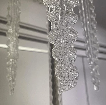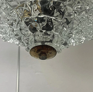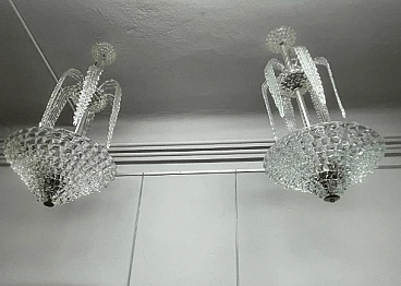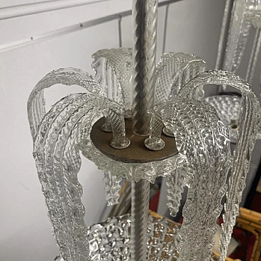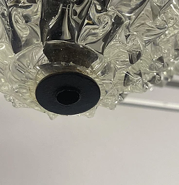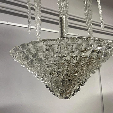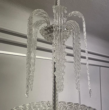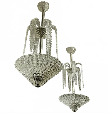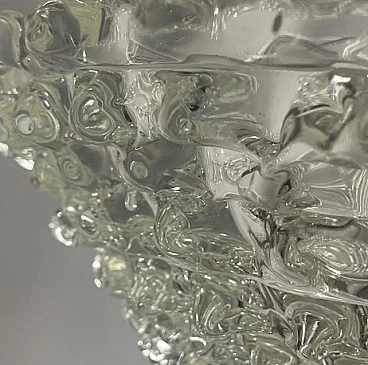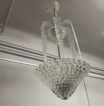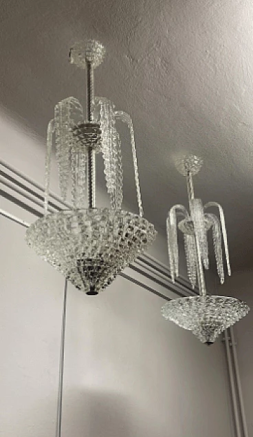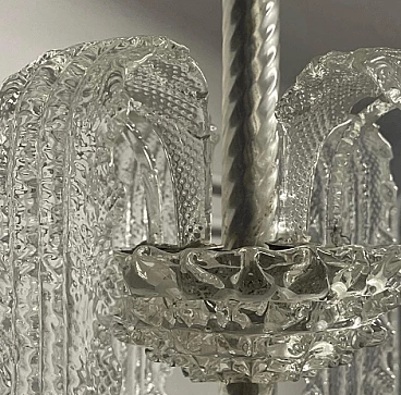 Lampadario in vetro di Murano rostrato soffiato a mano disegnato da Ercole Barovier e prodotto da Barovier & Toso, anni '40. Composto da una grande coppa che contiene la luce, questa è sormontata da un'altra coppa più piccola nella quale alloggiano sei foglie cadenti. I cavi sono ancora quelli originali. Usura coerente con l'età e l'uso. Due lampadari disponibili (prezzo per pezzo).