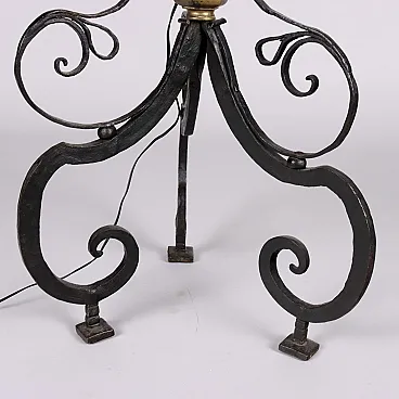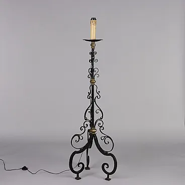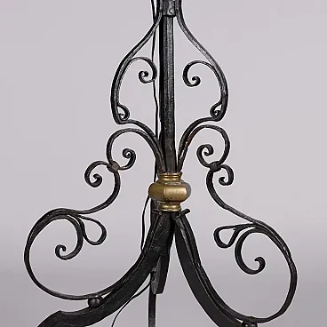 Candeliere in ferro battuto ornato con motivi a ricciolo, presenta inserti in ottone dorato.