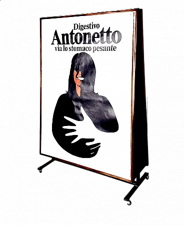 Un tempo utilizzata nel cinema come pannello double face per le locandine cinematografiche, la struttura è dotata di una base mobile che ne facilita lo spostamento a seconda delle esigenze. Completamente restaurato: la struttura in acciaio è stata riverniciata; i pannelli laterali in legno completamente restaurati e i pannelli in compensato verniciati di bianco come quelli originali. In ottime condizioni con pochi segni del tempo. Spedizione internazionale con copertura assicurativa e in cassa di legno o tramite corriere privato.