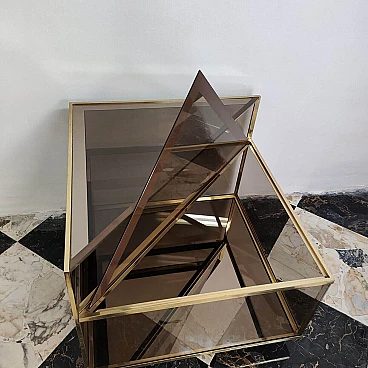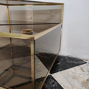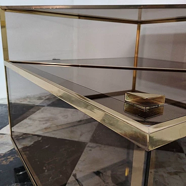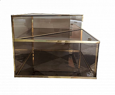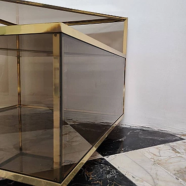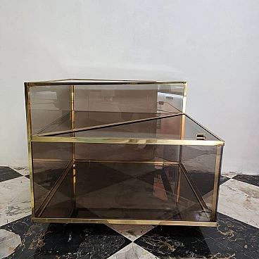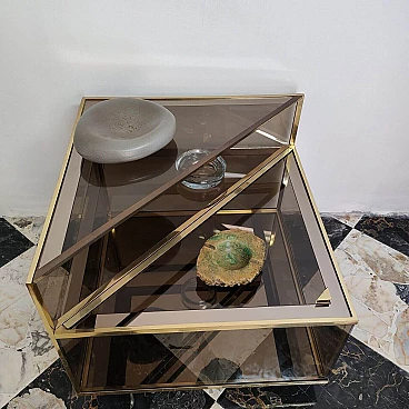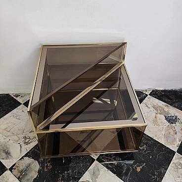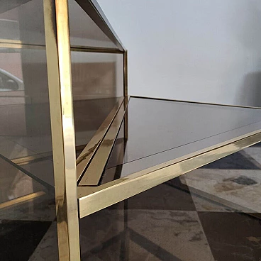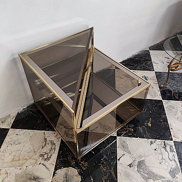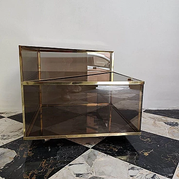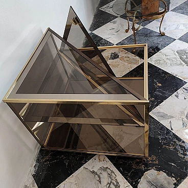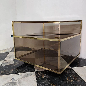 Mobile bar in ottone e vetro fumé con rotelle, fine anni '70. Bordi specchiati e anta a ribalta. Si tratta di un prodotto made in Italy che conserva tutto il suo fascino retrò. Ha una forma quadrata ed è dotato di quattro ruote che ne facilitano lo spostamento. All'interno dell'anta si possono riporre bottiglie o altri oggetti, sfruttando al massimo lo spazio in modo funzionale. Questo tavolino/mobile bar presenta i segni del tempo e la patina dell'ottone, che ne testimoniano l'autenticità e il valore. È un pezzo raro e molto ricercato dagli appassionati di design vintage.