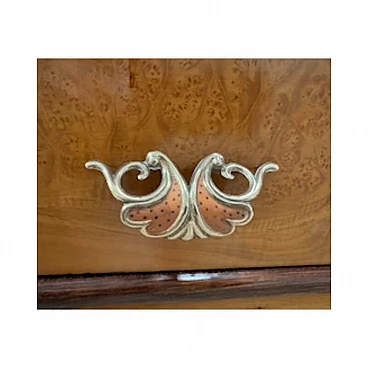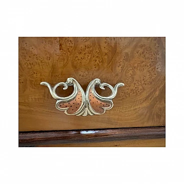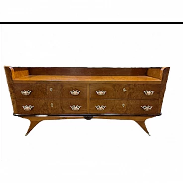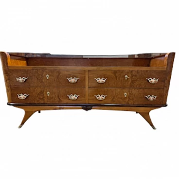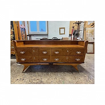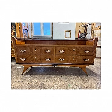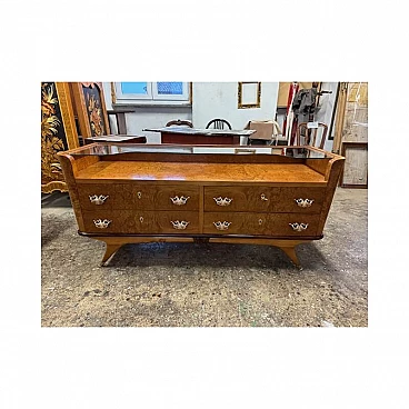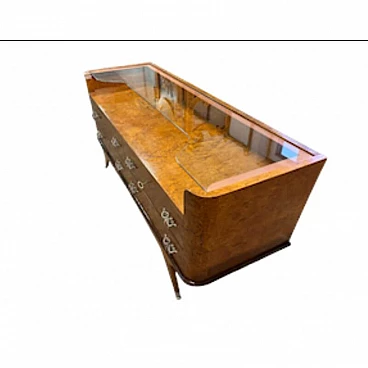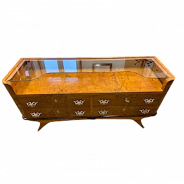 Cassettiera in radica di betulla con fronte a quattro cassetti e piano in vetro, anni '50