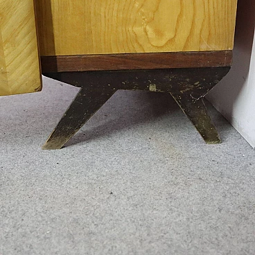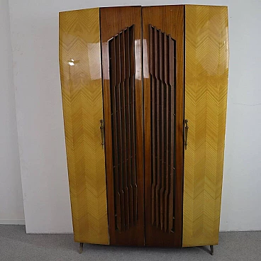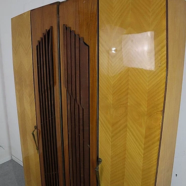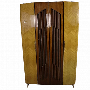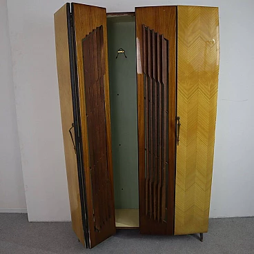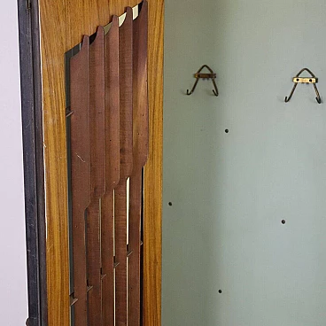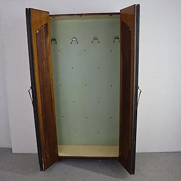 Questo eccezionale appendiabiti degli anni '50 rappresenta un raro esempio di storia del design. La sua unica apertura a ventaglio lo trasforma in un'opera d'arte, caratterizzata da un design distintivo e originale. Realizzato con ante in legno di noce e dettagli in acero a lisca di pesce, la sua combinazione di materiali esalta l'eleganza e la raffinatezza del periodo. Nonostante mostri segni del tempo, il pezzo è perfettamente funzionante e conserva la sua integrità strutturale. Con le sue dimensioni generose diventerà un elemento di spicco in qualsiasi ambiente. La sua rarità lo rende un autentico tesoro per collezionisti e amanti del design vintage, offrendo un tocco di eleganza unica agli interni della casa.