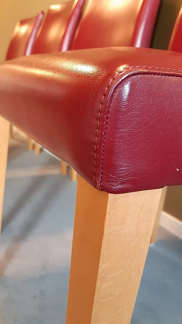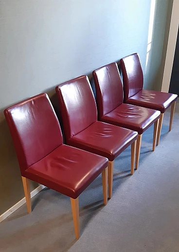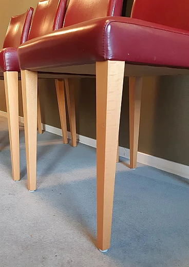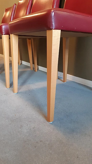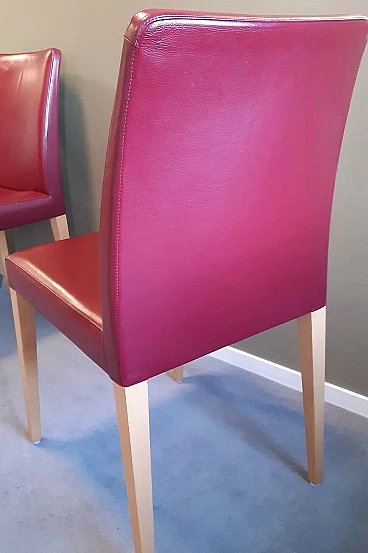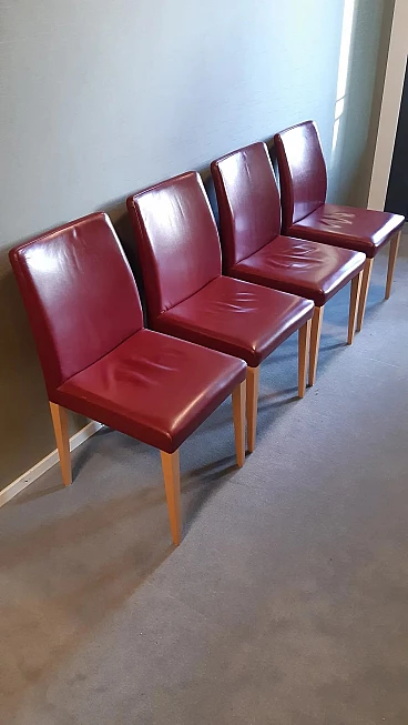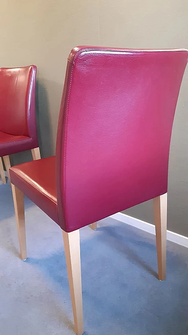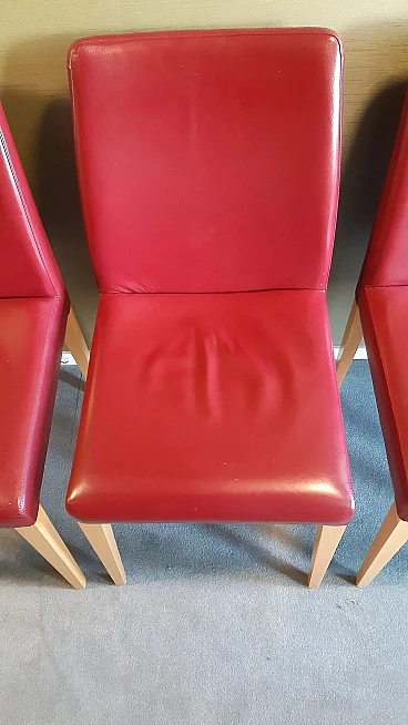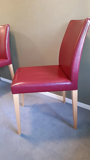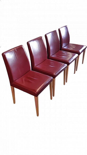 Quattro bellissime ed eleganti sedie Vittoria di Poltrona Frau, modello senza tempo, in condizioni molto buone. Minimi segni di utilizzo. Raffinate sedute per sala da pranzo. La pelle è morbida ed in buonissime condizioni. Nessun danno. Le sedie sono state tenute molto bene. La base dei sedili è ancora buona ma come mostrato nelle foto, la superficie della pelle presenta delle normali pieghe del pellame nei sedili. Per il resto sono ok. La struttura è in legno massello di faggio, stagionato color miele. Rivestimento esterno in morbida pelle Frau® color rosso. Seduta leggermente concava e schienale intero sagomato sono imbottiti in poliuretano espanso. Il molleggio della seduta è ottenuto con cinghie elastiche. Prezzo nuovo della sedia 910 euro. Prezzo del set nuovo 3600 euro. Vittoria si caratterizza per il suo raffinato schienale, stile XX secolo, che termina con una voluta aperta appena accennata e per il tradizionale rilievo di bordura a filetto. Eleganza senza tempo.
