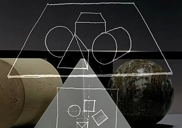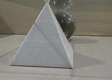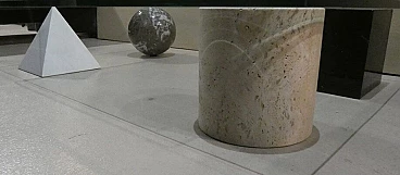 Qui la combinazione "storica" con la piramide in marmo Bianco di Carrara (marmo P. Bianco), il cubo in marmo Nero Marquinia, il cilindro in marmo Travertino e la sfera in marmo Mondragone o Rasotica (oggi Emperador Dark).