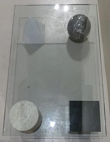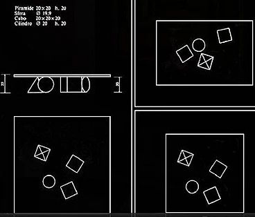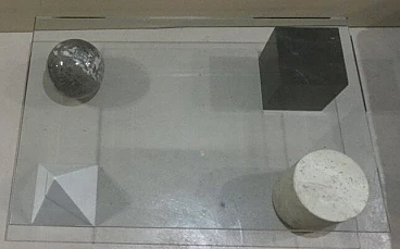 In origine esistevano almeno 3 varianti dimensionali del piano vitreo: rettangolare (120 x 80 x 2 cm); rettangolare piccolo (100 x 65 x 2 cm); quadrato grande (120 x 120 x 2 cm). L'altezza massima dei solidi come diametro del cilindro era di 20 cm, mentre il diametro della sfera era leggermente inferiore (19,8/19,9 cm). Dimensioni dei solidi: cubo: 20 x 20 x 20 [h] cm; piramide: 20 x 20 x 20 [h] cm; cilindro: 20 [Ø] x 20 [h] cm; sfera: 19,8/19,9 [Ø] cm; peso solido: 17/22 kg.