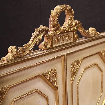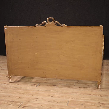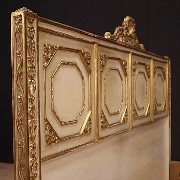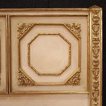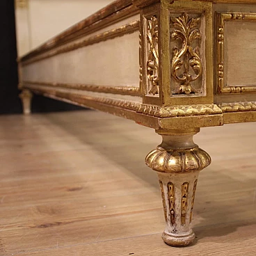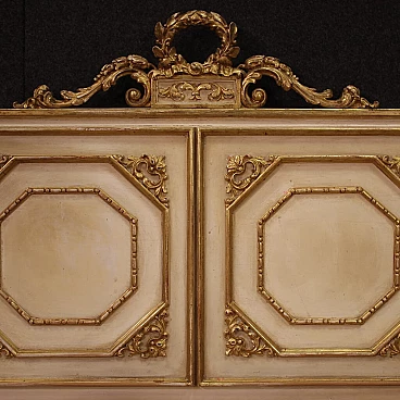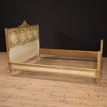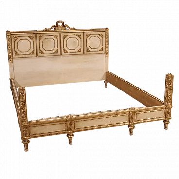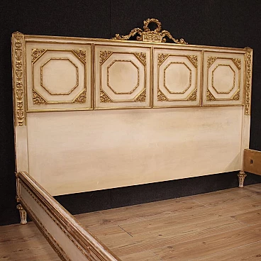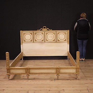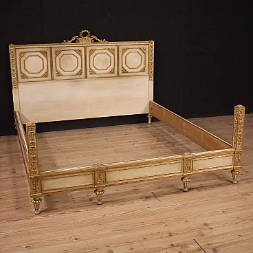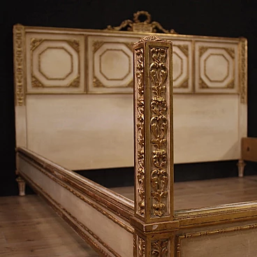 Letto italiano della metà del XX secolo. Mobile in stile Luigi XVI finemente scolpito, laccato e dorato di ottima qualità. Letto matrimoniale che può ospitare una struttura interna (non compresa nell'offerta) dalle seguenti misure massime: L 169 x P 201 cm. Letto di grande carattere, finito su tre lati e adornato da pilastri frontali e cimasa con ghirlanda dorata (vedi foto). Mobile composto da quattro elementi separabili (testiera, pediera, 2 sponde laterali) per facilitarne lo spostamento e l'inserimento in casa, da fissare con appositi e solidi tiranti in metallo (vedi foto). Letto di ottima solidità sostenuto da 6 piedi svasati, anch'essi laccati e dorati. Strutturalmente sano e in bella patina, nel complesso in buone condizioni.