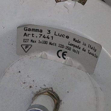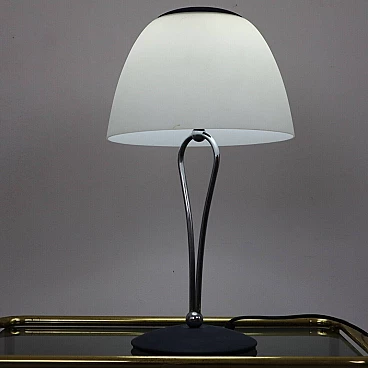 Una lampada da tavolo elegante e stilisticamente versatile firmata Gamma 3 Luce, un esempio del design italiano anni '80. La lampada, con un'altezza di 60 cm e un diametro di 30 cm, combina funzionalità e design. Il corpo centrale in metallo cromato si incurva delicatamente, formando una silhouette snella e moderna che sostiene un paralume conico in vetro opalino. Questa combinazione di materiali crea un contrasto visivo affascinante, con il metallo lucido che riflette la luce e il vetro che la diffonde soffusamente nell'ambiente. Il paralume, in particolare, è progettato per offrire una luce calda e accogliente, ideale per creare atmosfere intime in ambienti domestici o uffici. La lampada è stata creata per utilizzare una lampadina E27 fino a 100 Watt, permettendo una illuminazione ottimale per leggere, lavorare o semplicemente rilassarsi. Con la sua base solida e il design curvilineo, questa lampada da tavolo non è solo un oggetto pratico ma anche una scelta di stile che si adatta sia agli interni contemporanei che a quelli più classici. Perfetta per chi ama il design degli anni '80 e cerca un pezzo di illuminazione che sia al tempo stesso iconico e senza tempo.
